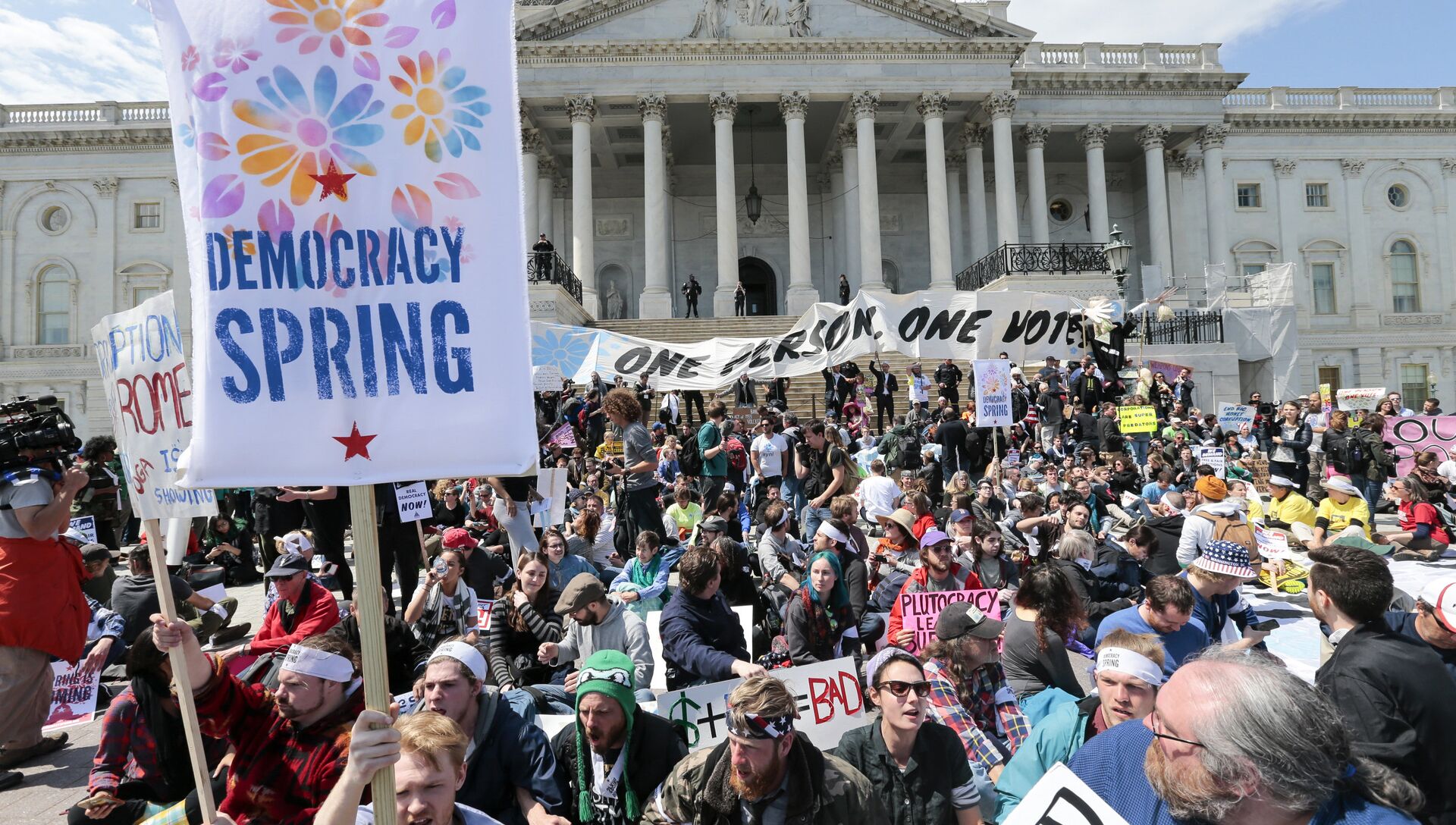 Люди, которые, наверное, думали, что они живут в свободной стране, собрались на лужайке у здания Капитолия, чтобы выразить свою гражданскую позицию и выступить против влияния больших денег на политику страны. Демонстрации против коррупции под окнами у конгрессменов они собираются проводить до конца недели.