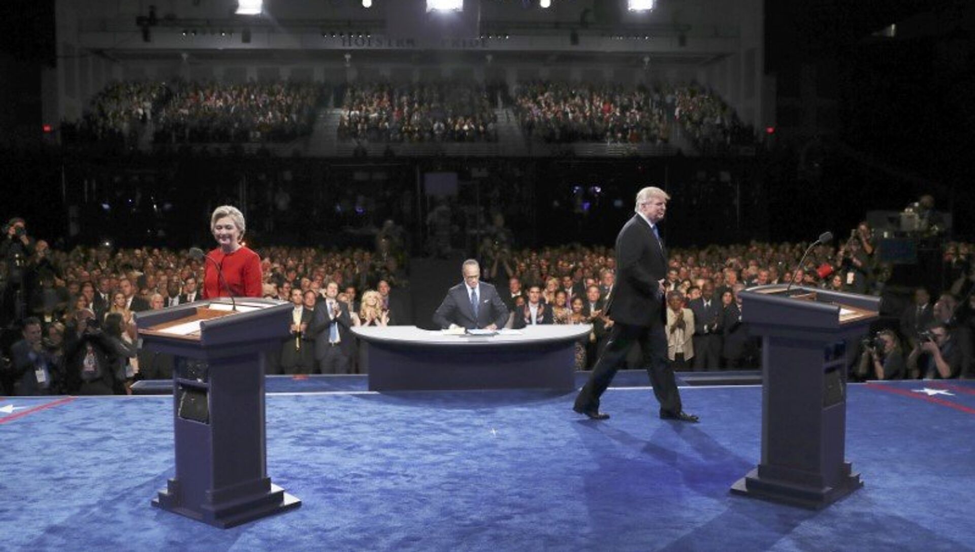 Говорили только о том, что уже бросалось в глаза. Поэтому не сказали ничего нового. Но здесь ведь и имело значение не то, что скажут, а как. Это же "голливуд" – внешние эффекты важнее смысла. Манера, реакция, гримасы, игра. "Ужимки и прыжки". Чтобы зрительно нивелировать 25 сантиметров разницы в росте, Хиллари пошла на военную хитрость. Потребовала от организаторов чуть видоизменить ее трибуну и поставить постамент подальше от почти баскетбольного Дональда. Мерялись они, понятно, совсем не размерами, но уж очень Клинтон не хотела, чтобы оппонент смотрел на нее сверху вниз. Ставки крайне высоки. А разрыв столь ничтожен, что и такая деталь способна повлиять на настроения и решить исход борьбы.
