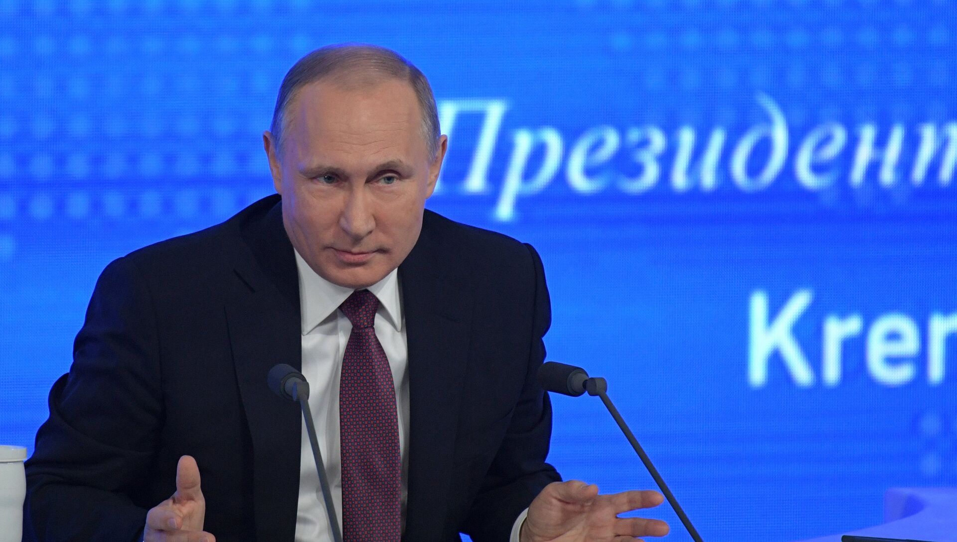 © РИА Новости / Григорий Сысоев | Перейти в медиабанкПрезидент РФ Владимир Путин на двенадцатой большой ежегодной пресс-конференции в Центре международной торговли на Красной Пресне. 23 декабря 2016