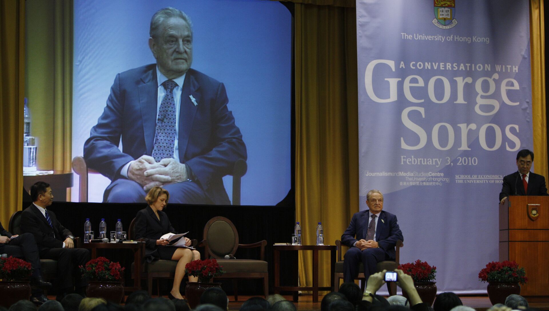 © AP Photo / Kin CheungАмериканский финансист и инвестор Джордж Сорос выступает на форуме в университете Гонконга, архивное фото