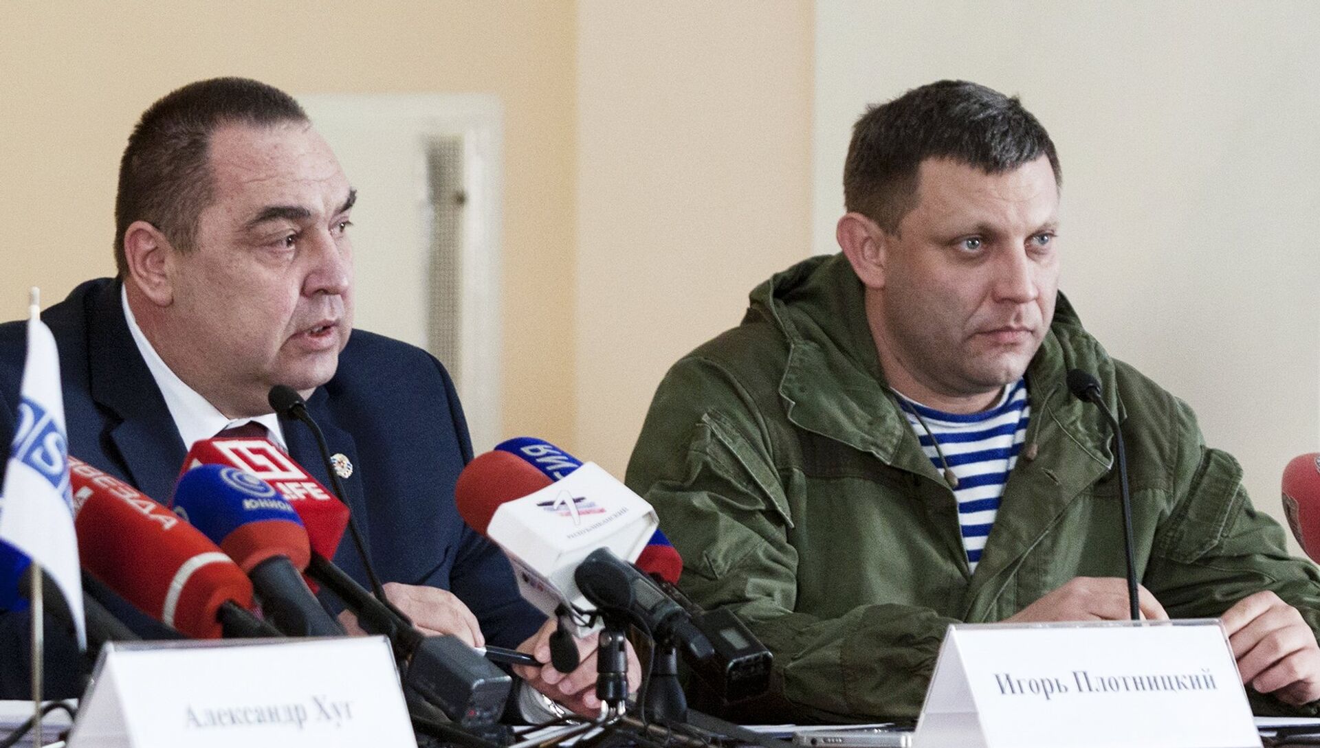 © РИА Новости / Николай Сидоров | Перейти в медиабанкГлава ДНР Александр Захарченко и глава ЛНР Игорь Плотницкий на совместной пресс-конференции в Луганске. 17 февраля 2017