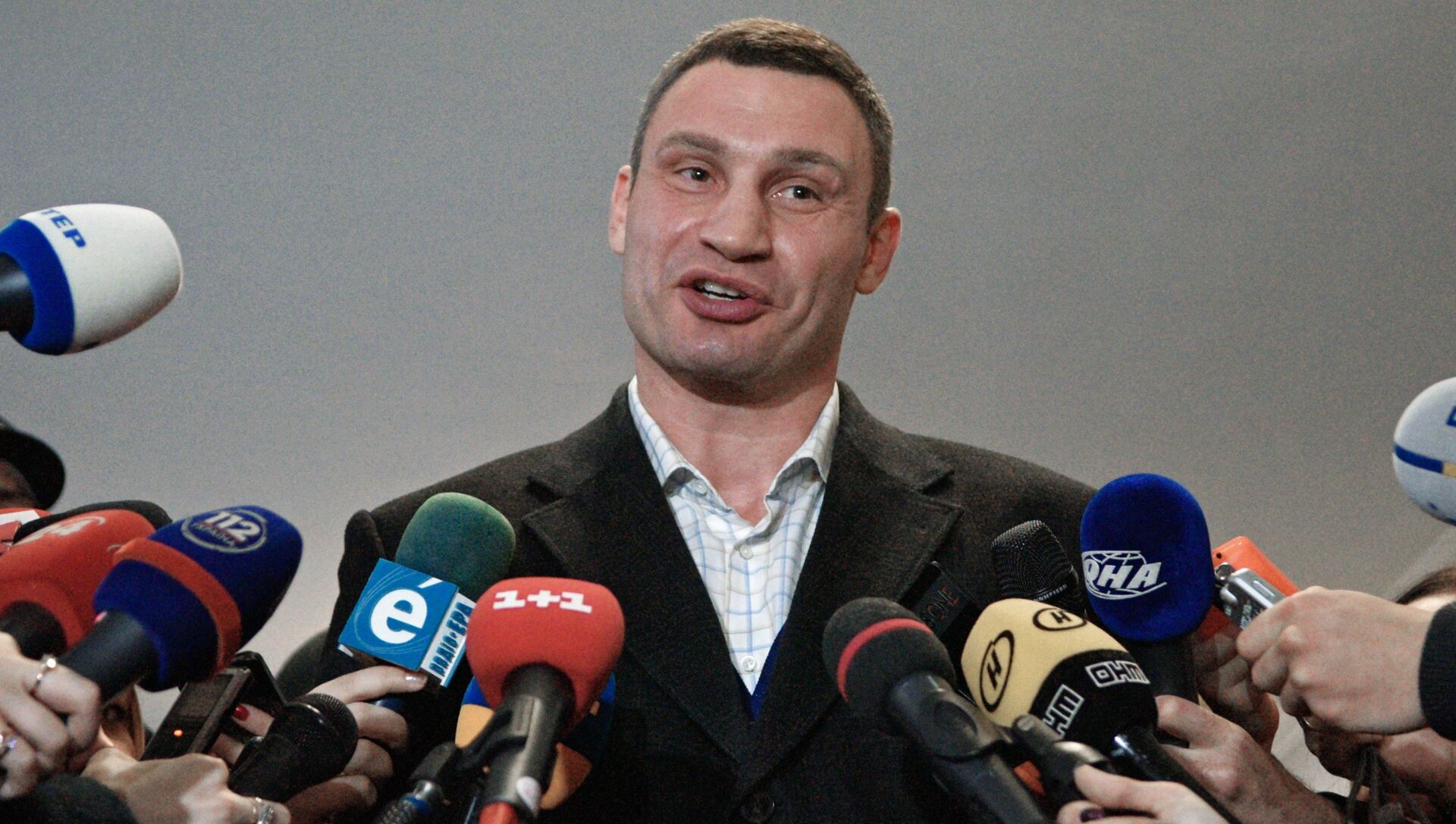 © РИА Новости / Стрингер | Перейти в медиабанкЛидер объединенной партии "Солидарность", мэр Киева Виталий Кличко общается с журналистами на избирательном участке в Киеве во время второго тура выборов в органы местного самоуправления