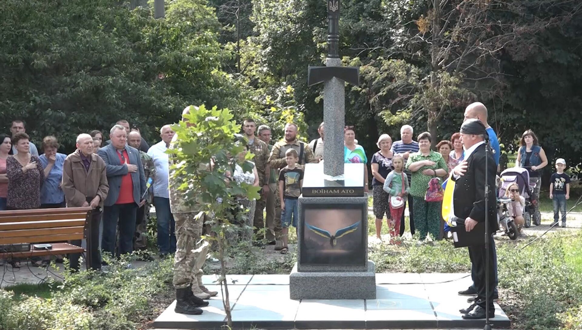 В Киеве установили памятник бойцам ВСУ, погибшим в ходе силовой операции в Донбассе. Видео открытия мемориала публикует RT.