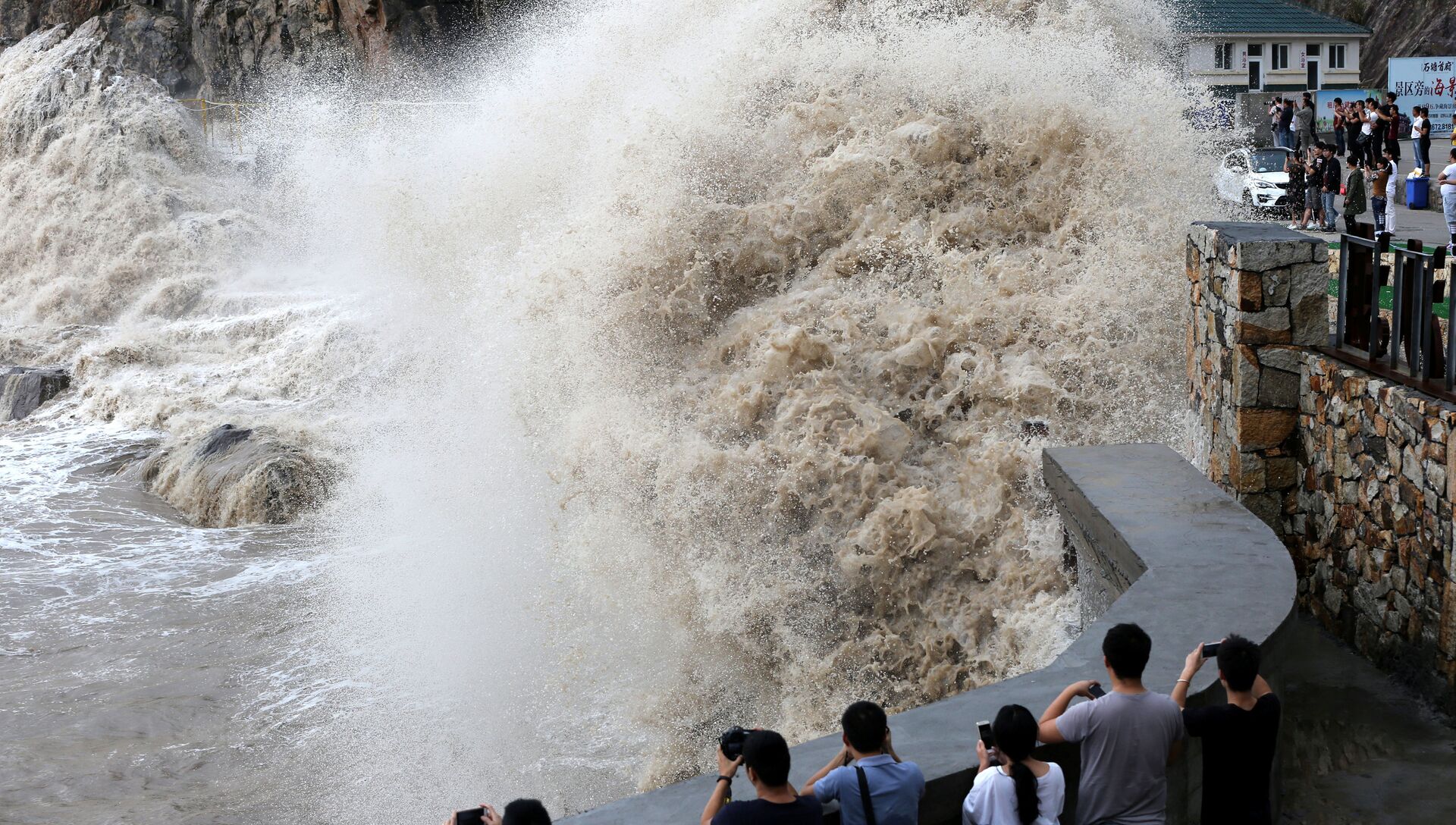 Люди на набережной в китайском Вэньлине во время тайфуна Тамлин. 14 сентября 2017