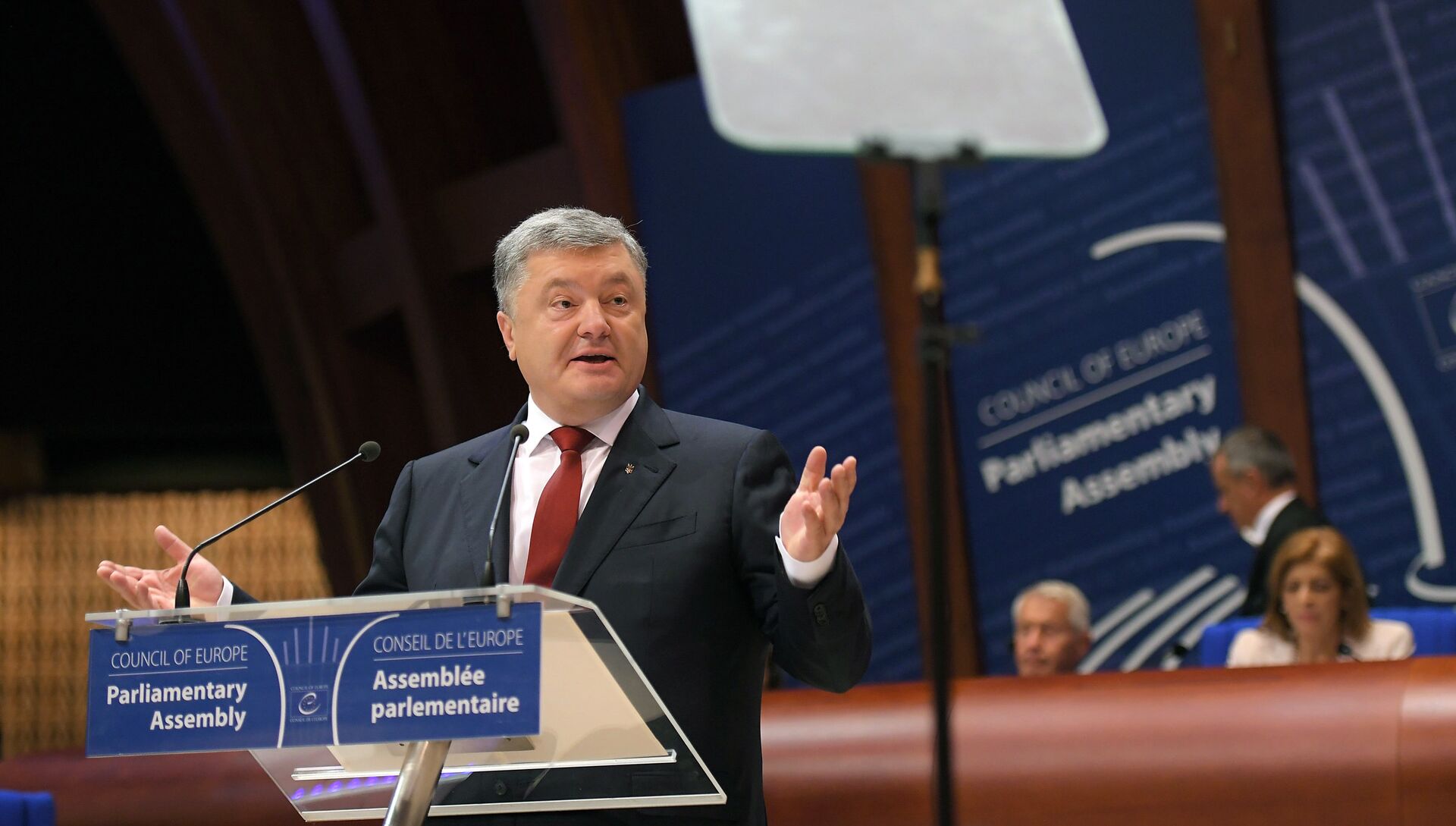 © AFP 2024 / Patrick HertzogПрезидент Украины Петр Порошенко во время выступления на заседании ПАСЕ в Страсбурге
