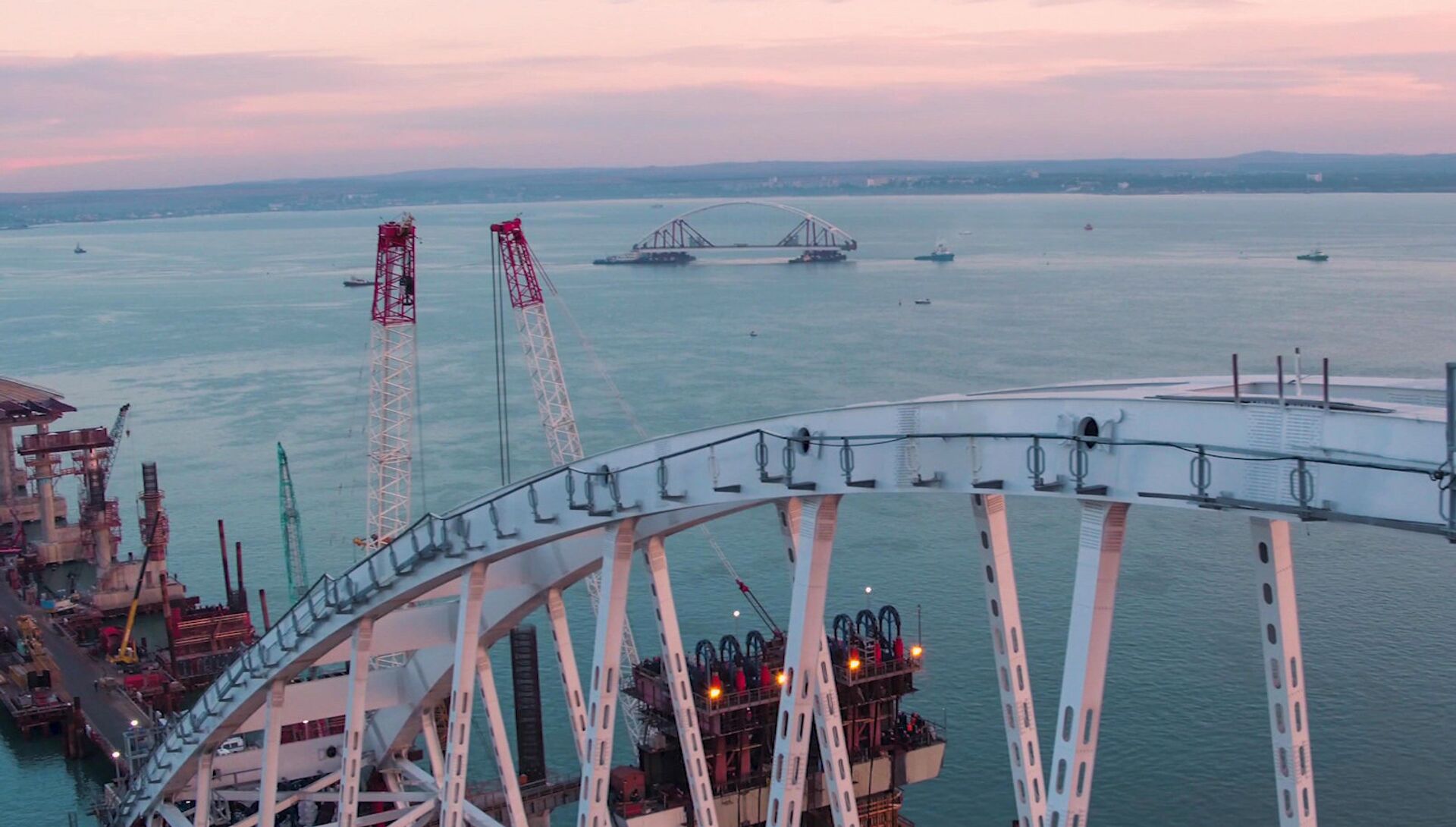 Транспортировку арки к месту установки на фарватерные опоры начали ранним утром в среду. Движение судов и кораблей в канале Керченского пролива закрыто на 72 часа. Арку весом более пяти тысяч тонн переместили на плавучих опорах с помощью буксиров.