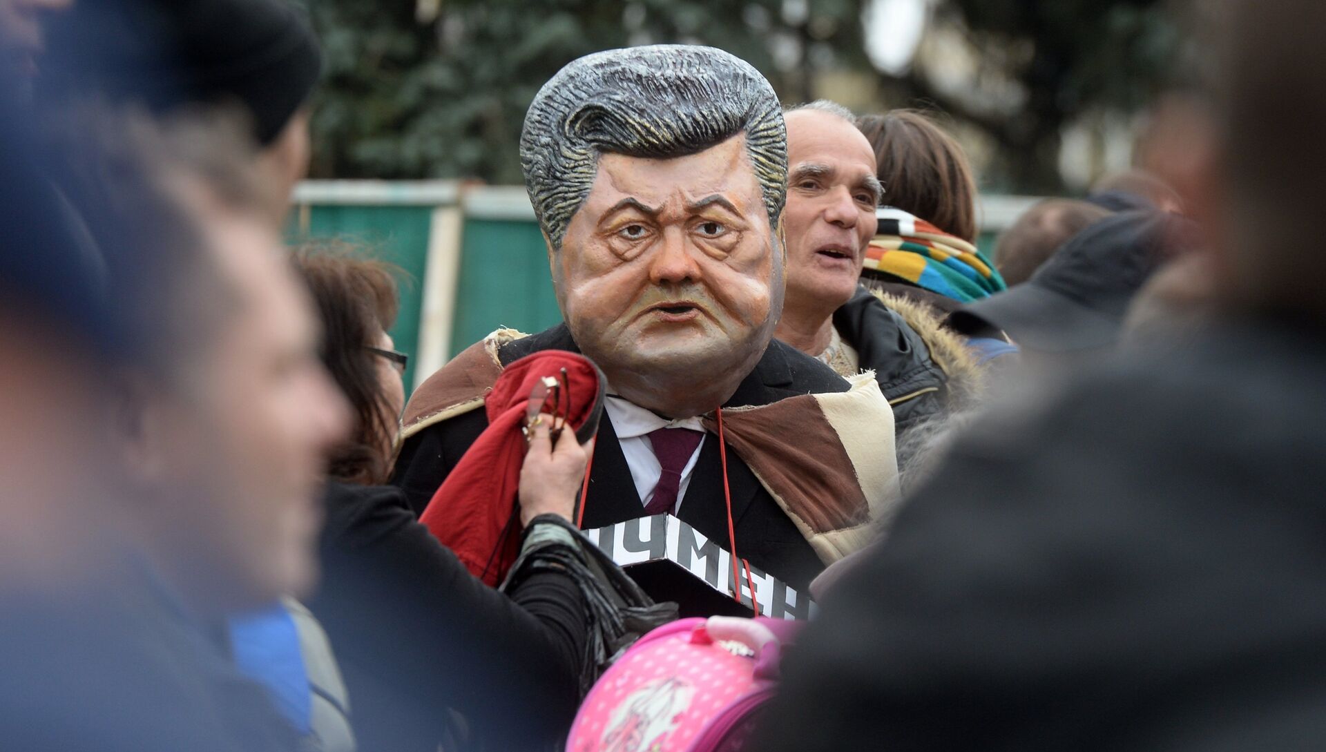 Как рассказал корреспондент РИА Новости, один из участников акции протеста устроил небольшое шоу: надел маску Порошенко, на шею повесил табличку с надписью "Импичмент" и танцевал.
