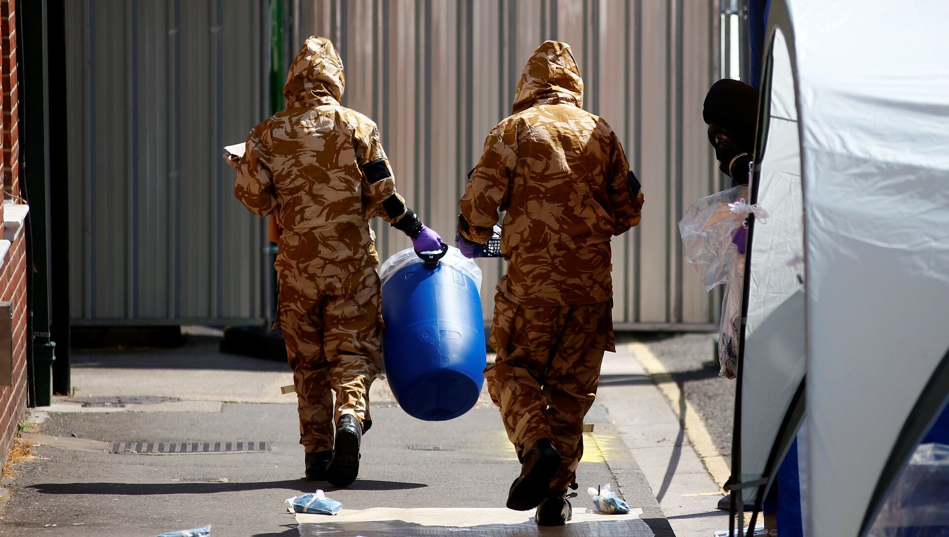 © REUTERS / Henry NichollsСотрудники британских спецслужб в защитных костюмах у жилого дома в Солсбери в связи с расследованием отравления людей в Эймсбери. 6 июля 2018