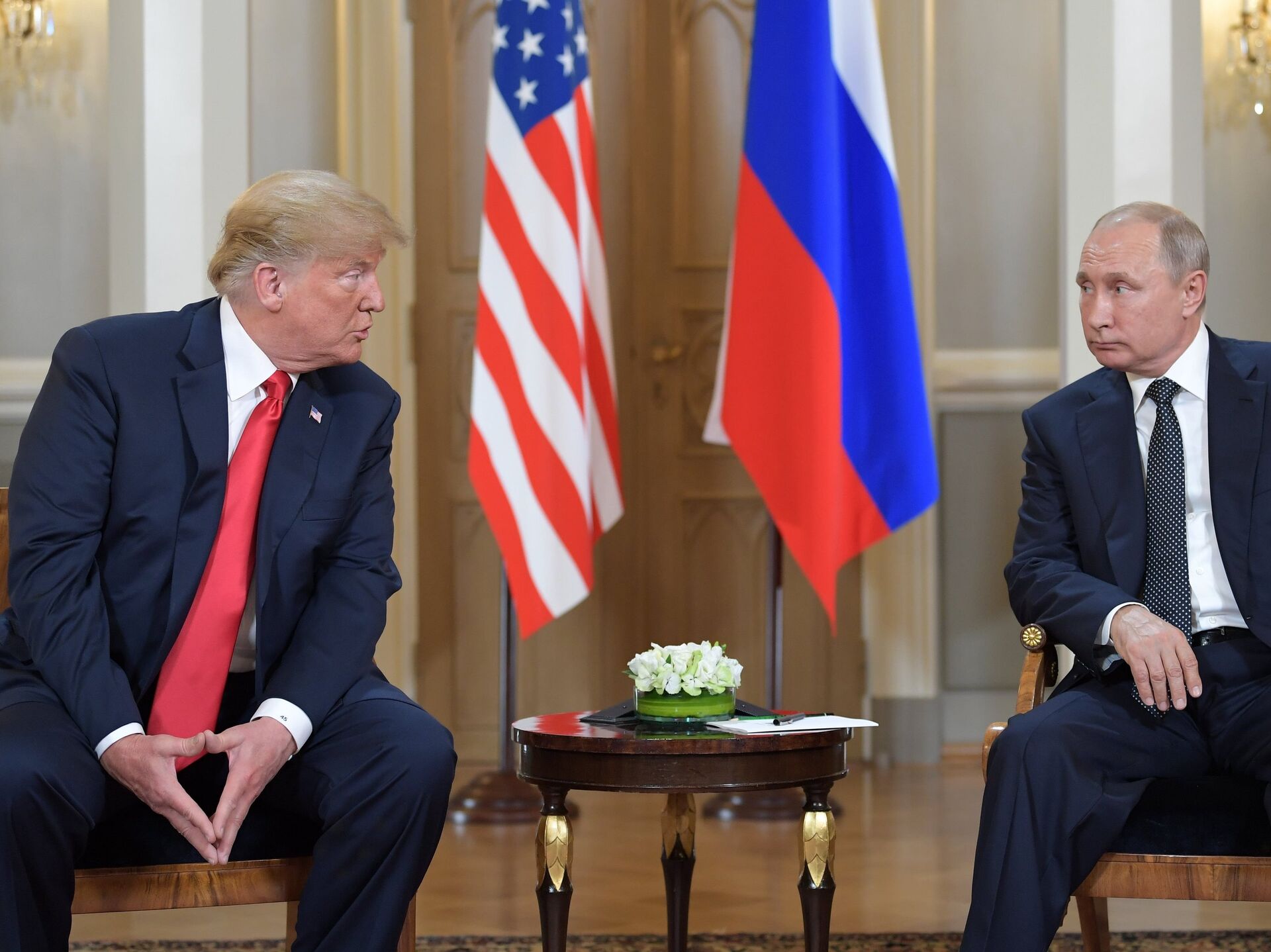 © РИА Новости / Сергей Гунеев | Перейти в медиабанкПрезидент РФ Владимир Путин и президент США Дональд Трамп во время встречи в президентском дворце в Хельсинки. 16 июля 2018