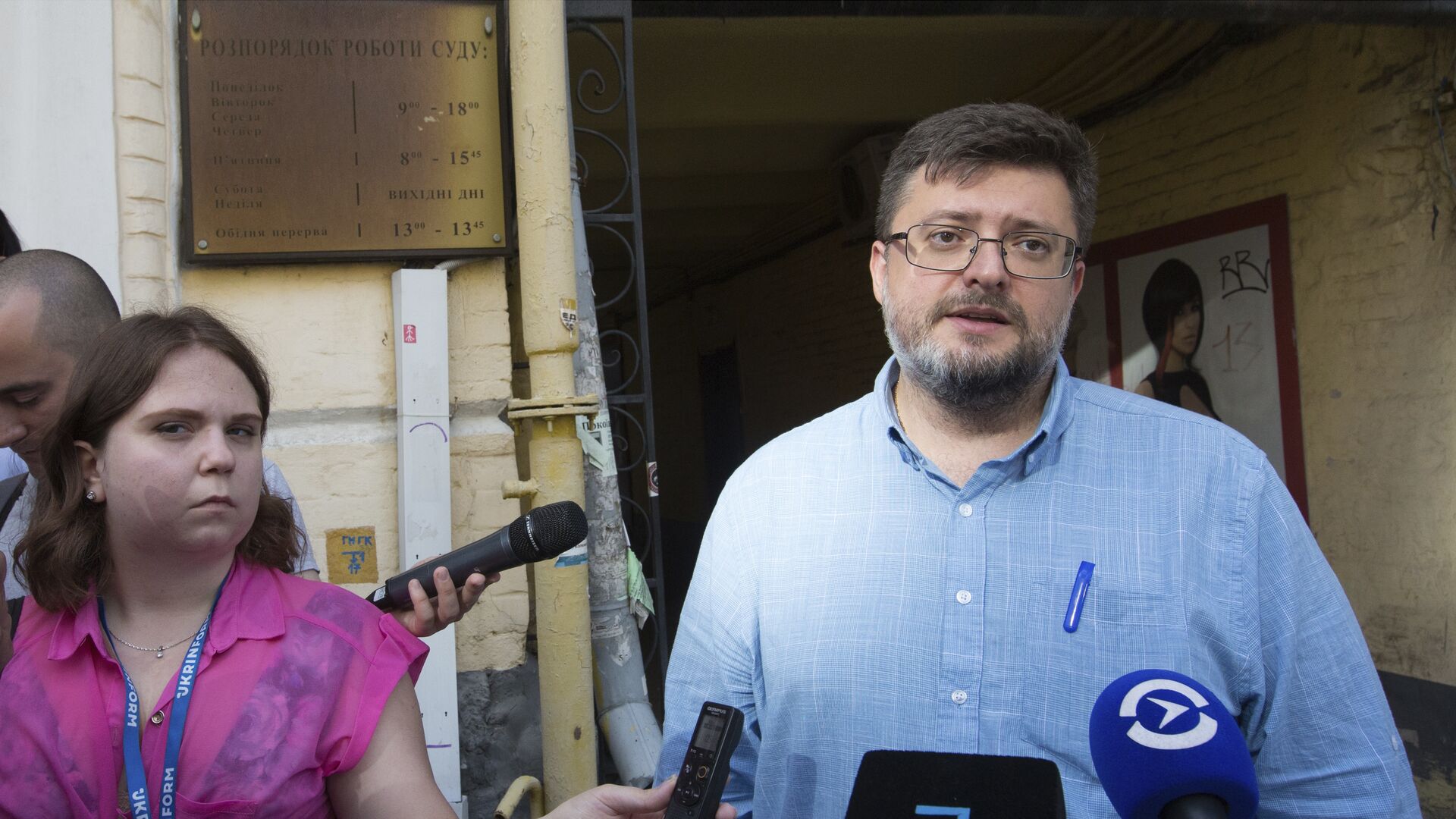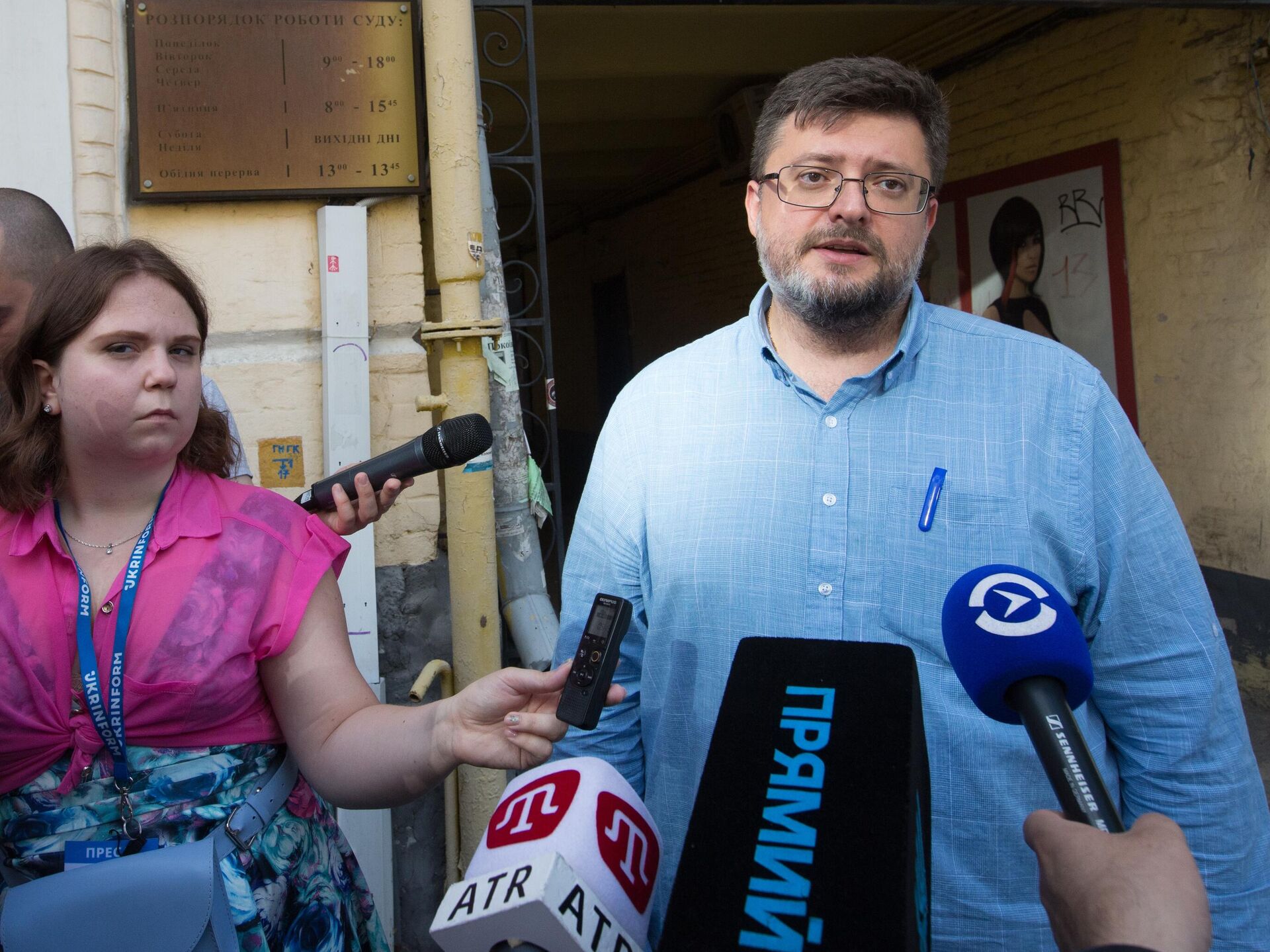 Руководитель портала РИА Новости Украина Кирилл Вышинский и его адвокат Андрей Доманский на заседании Подольского районного суда Киева. 3 июля 2019