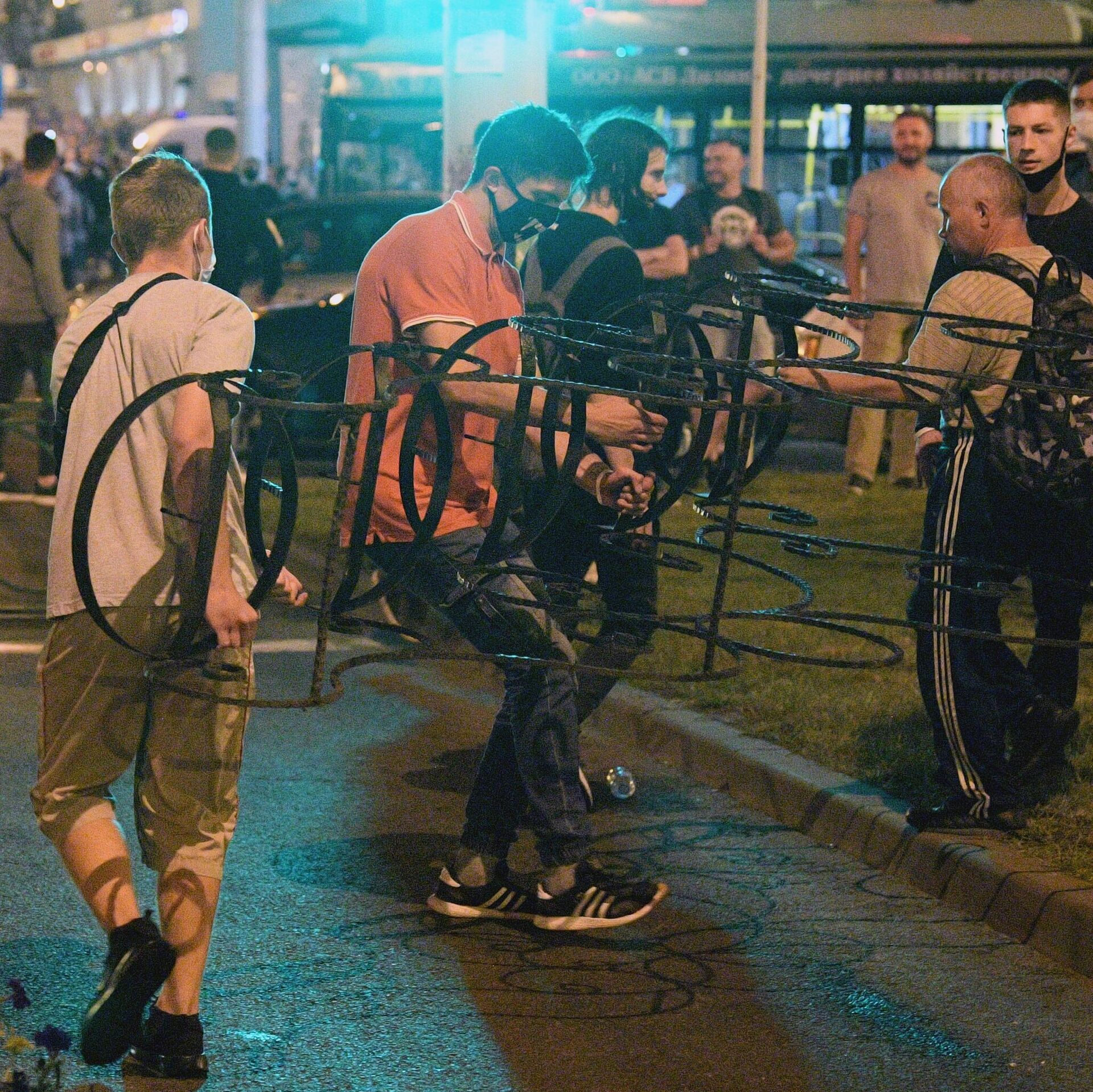 В районе станции перевернуты урны с мусором и бетонные вазоны для цветов. На месте вчерашних акций протеста работают коммунальщики. Работники служб подметают улицы и приводят в порядок участки газона.