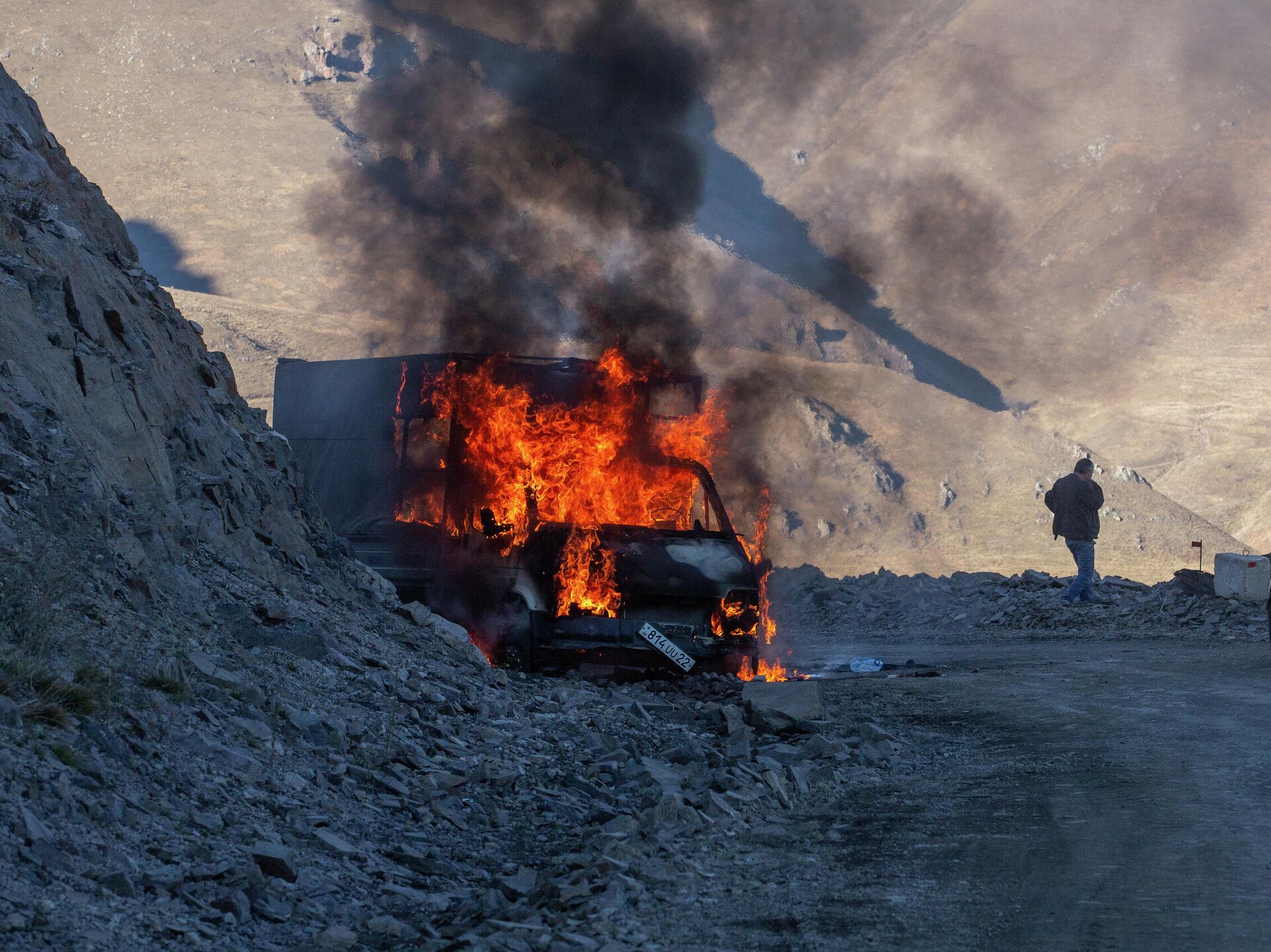 © РИА Новости / Илья Питалев | Перейти в медиабанкГорящий автомобиль на горной дороге в районе города Карвачар