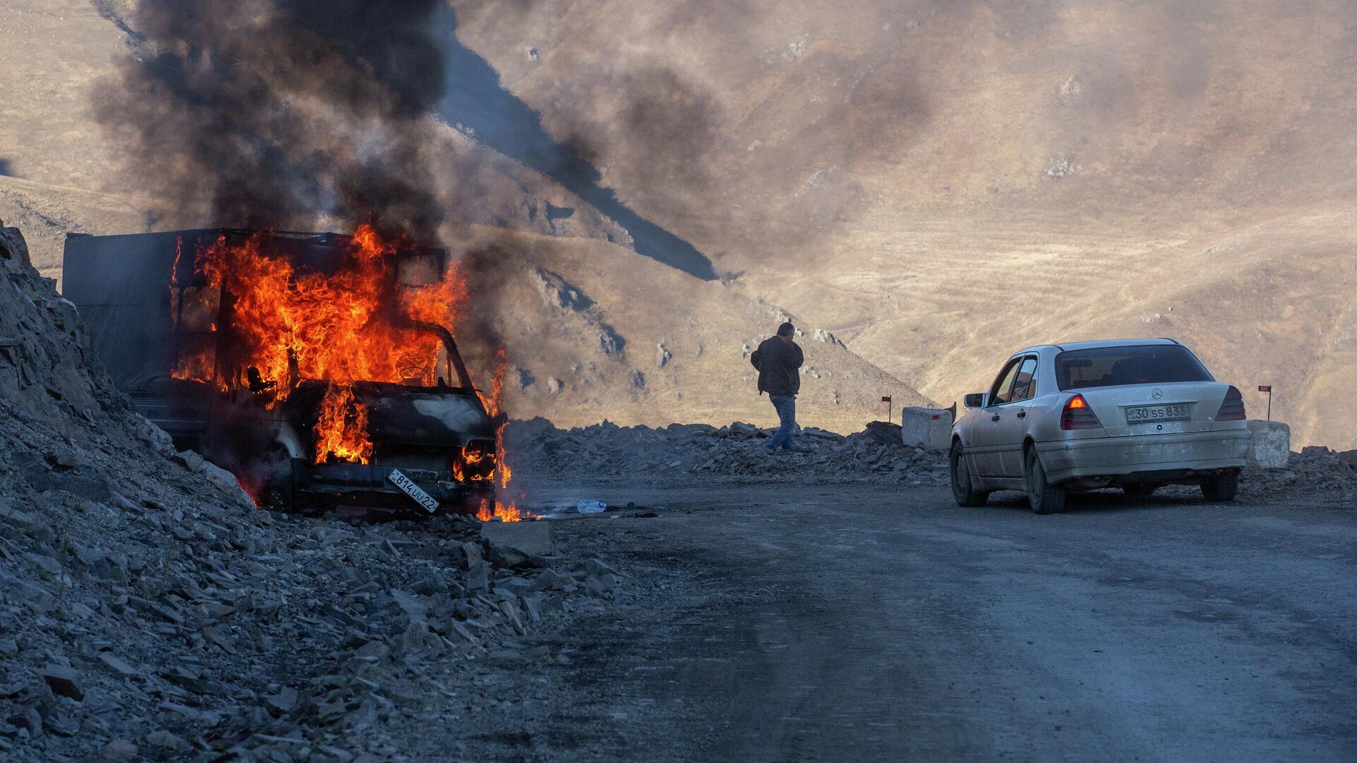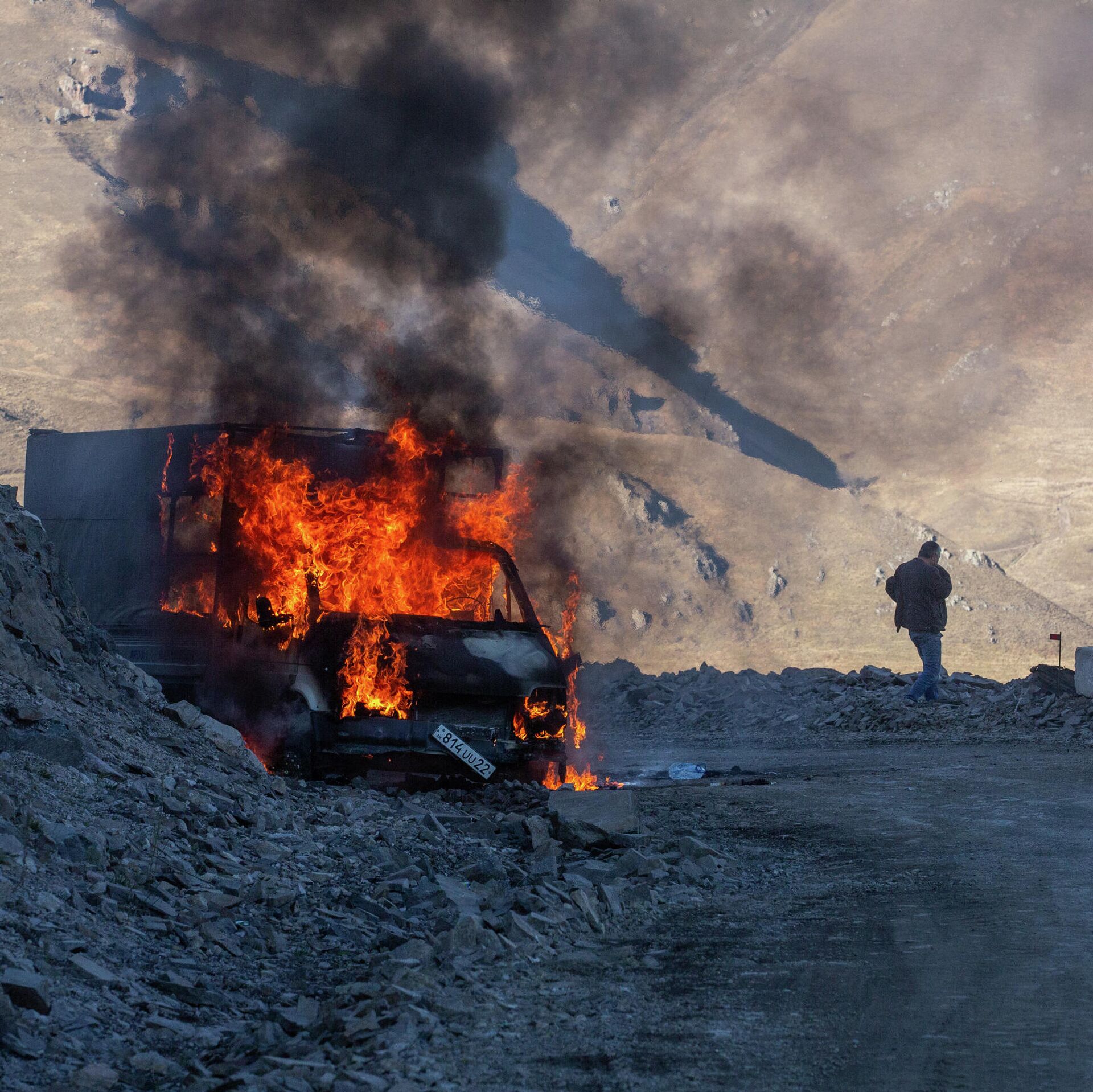 Горящий автомобиль на горной дороге в районе города Карвачар - РИА Новости, 1920, 09.11.2020