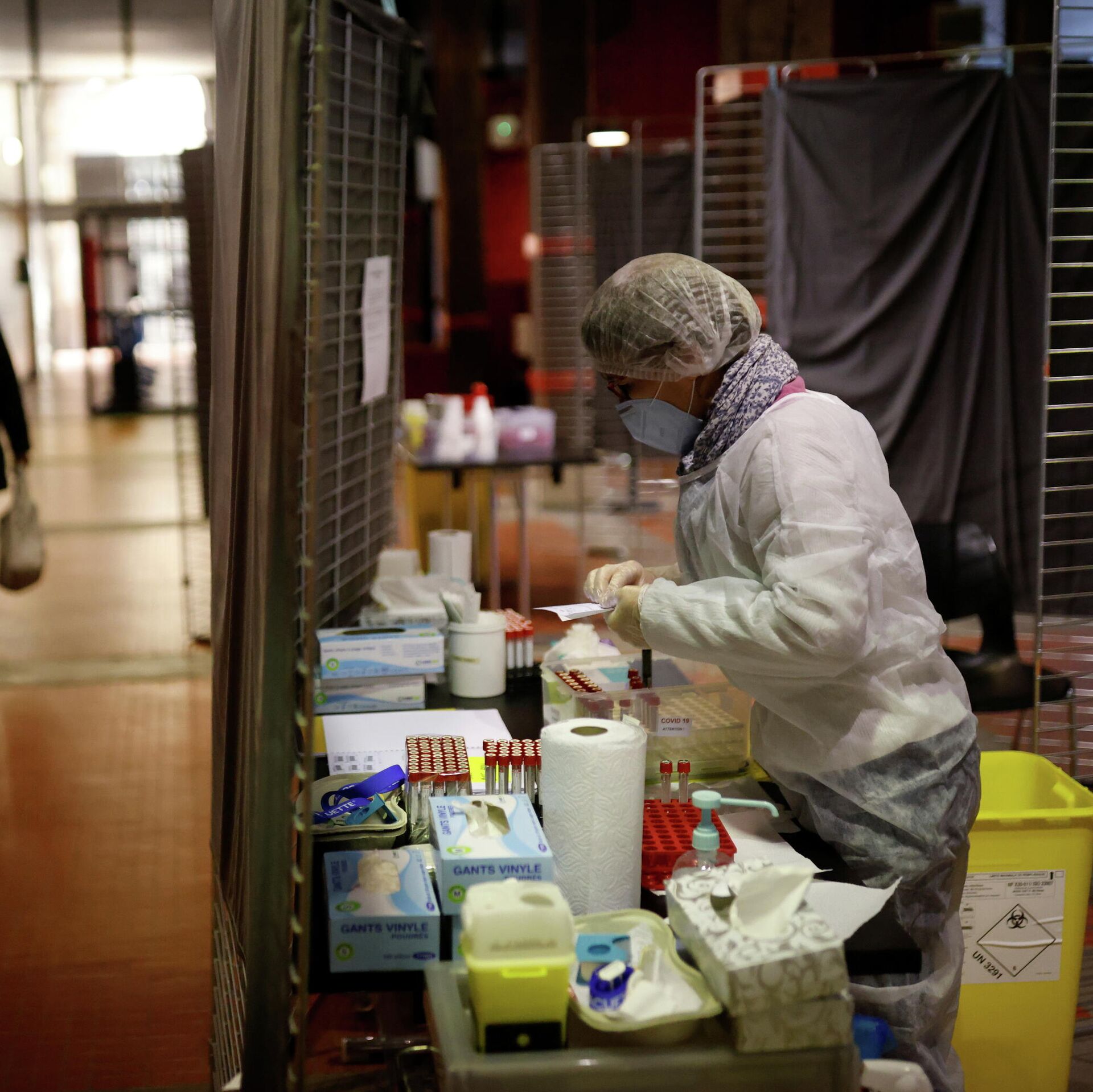 Медицинский работник в защитном костюме в центре тестирования на коронавирус во Франции - РИА Новости, 1920, 21.12.2020