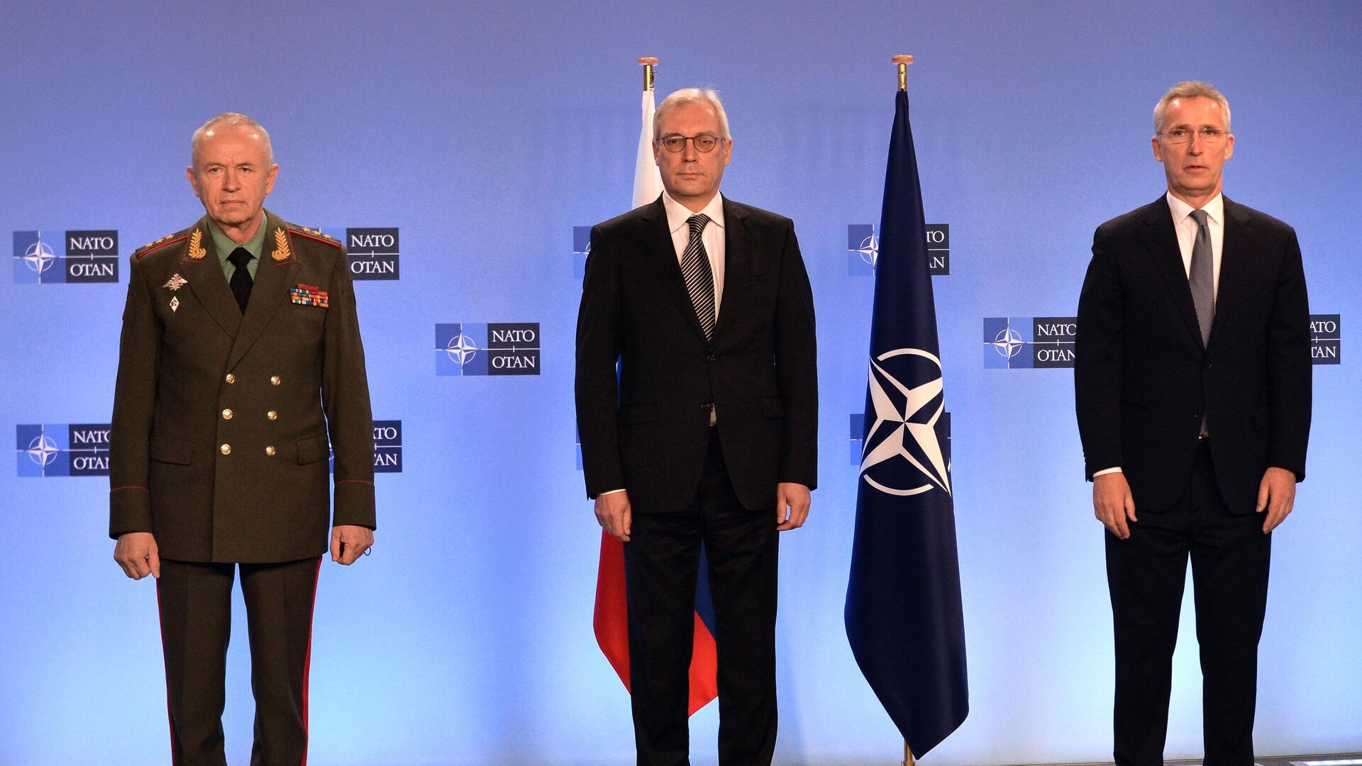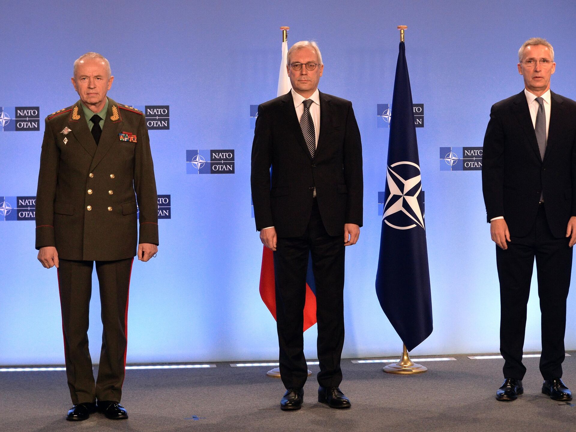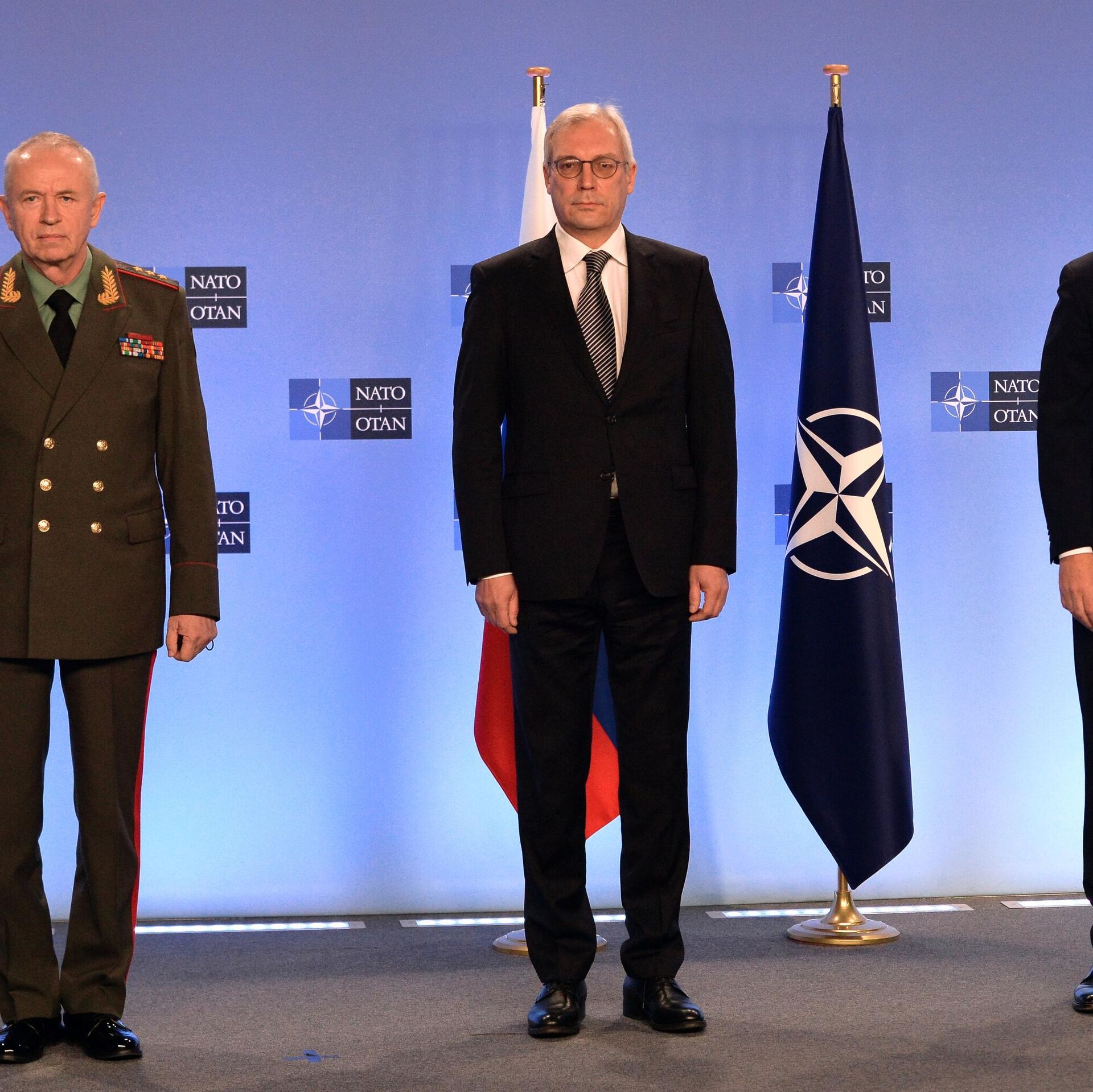 Заместитель министра обороны РФ Александр Фомин, заместитель министра иностранных дел России Александр Грушко и генеральный секретарь НАТО Йенс Столтенберг перед заседанием Совета Россия - НАТО в Брюсселе - РИА Новости, 1920, 12.01.2022