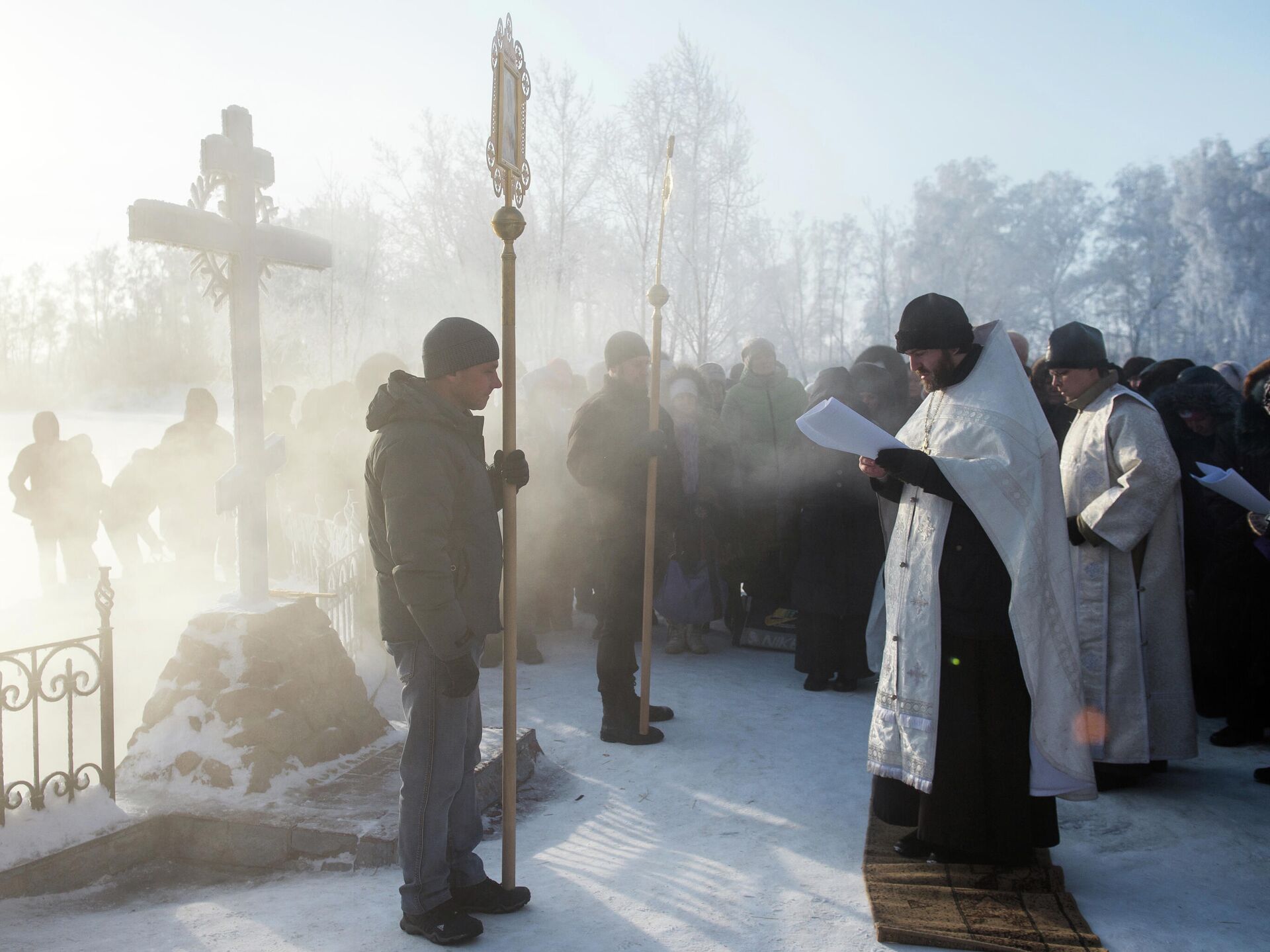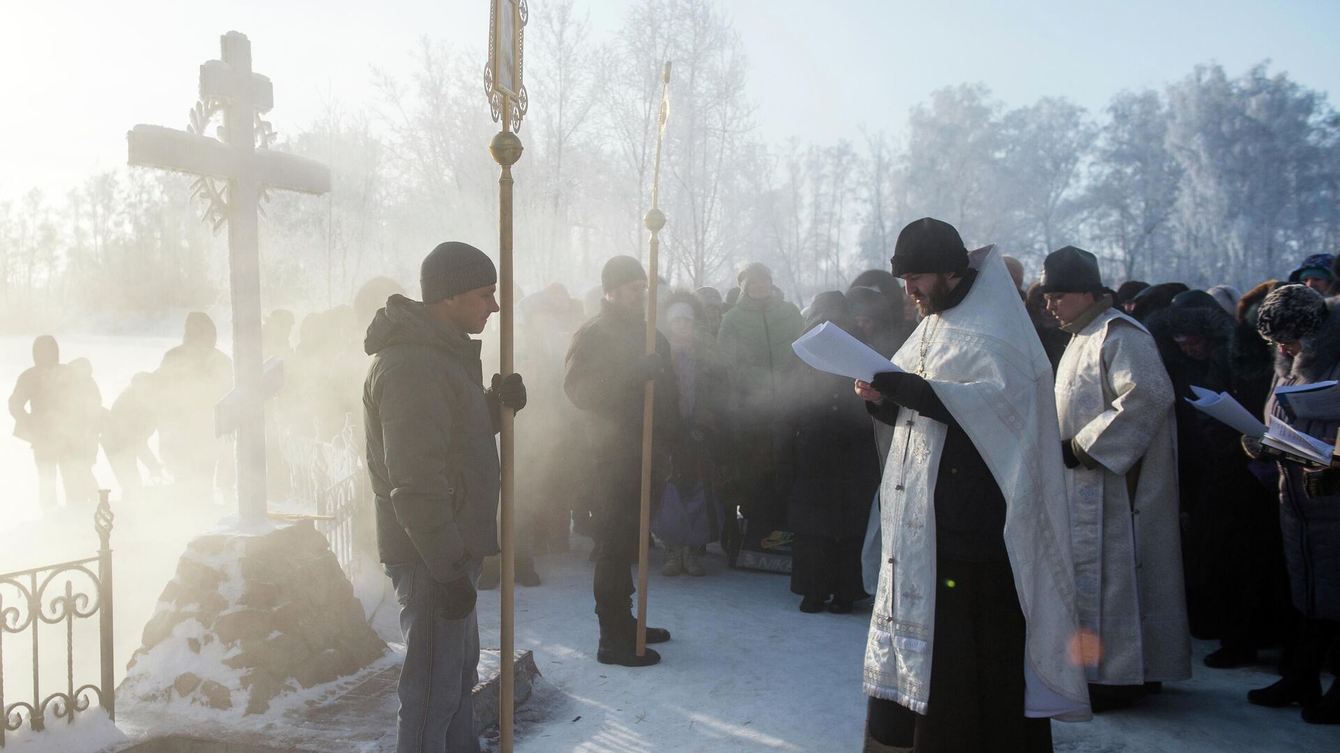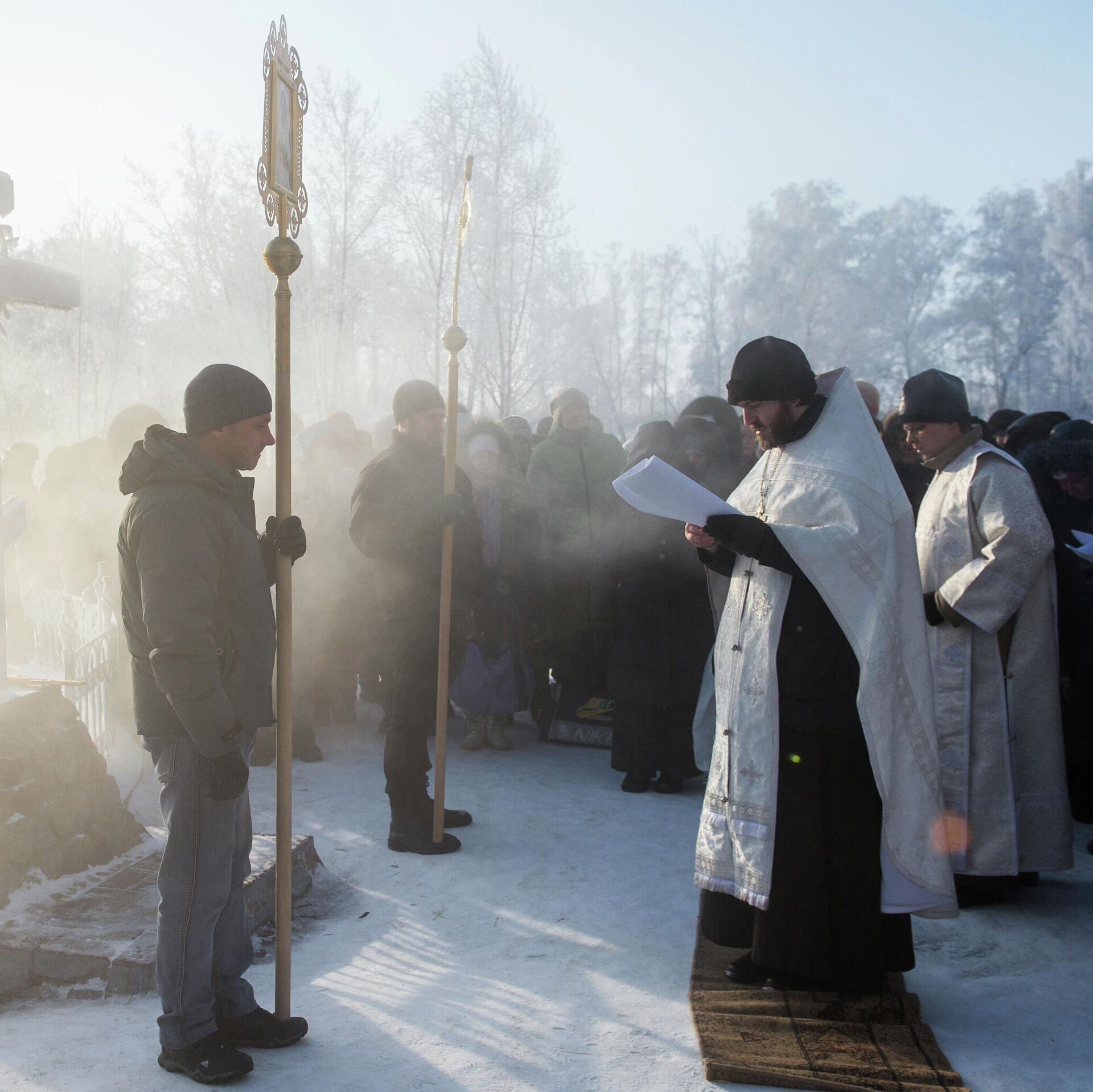 Священнослужители проводят молебен и освящение воды в источнике с целебной минеральной водой на территории Ачаирского женского монастыря Честного Креста Господня в Омской области - РИА Новости, 1920, 18.01.2022