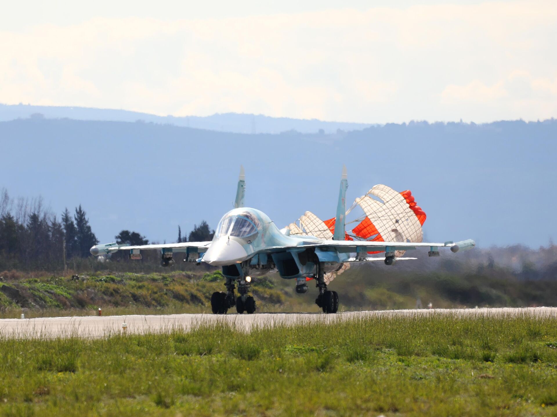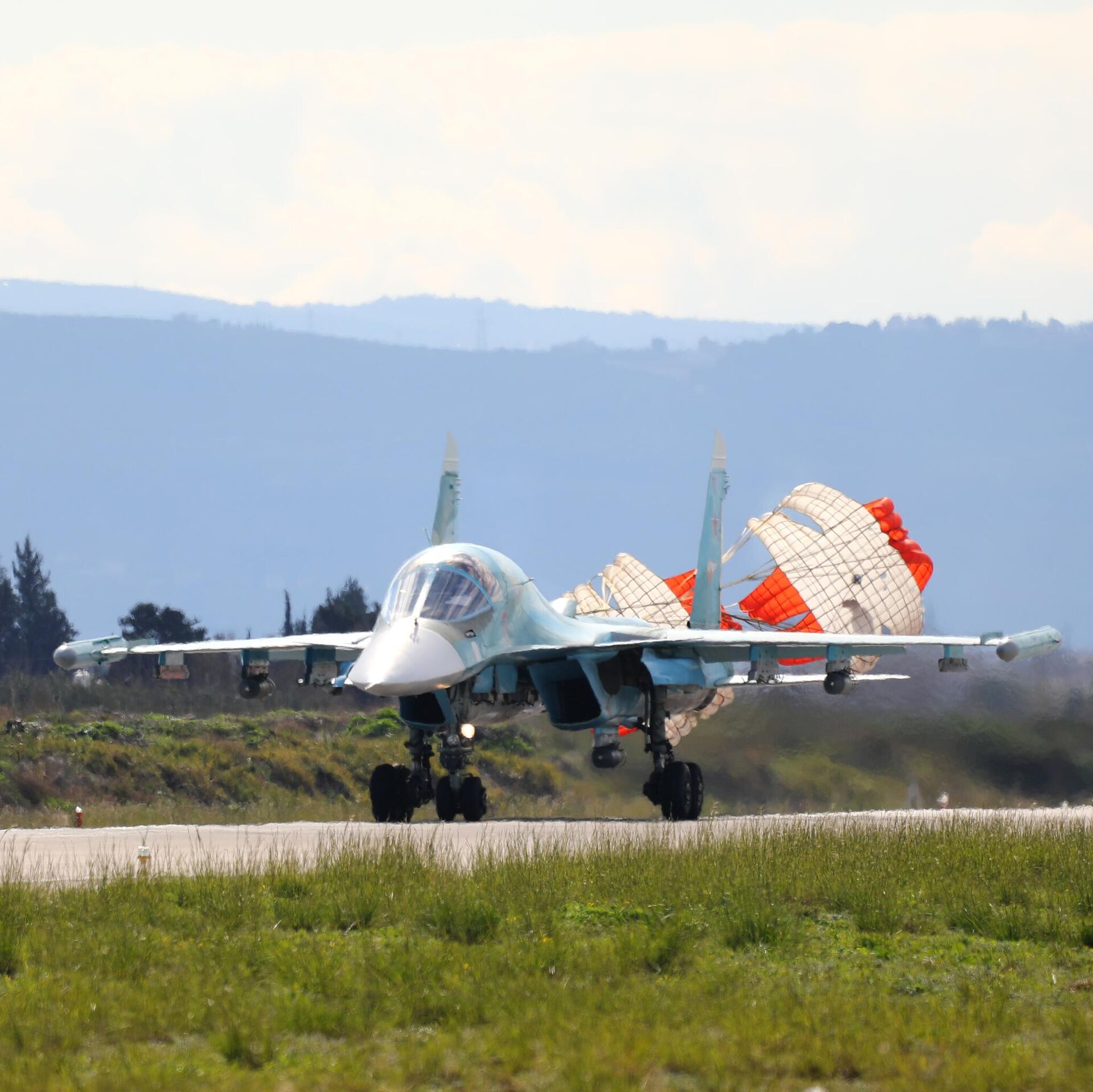 © РИА Новости / Управление пресс-службы и информации министерства обороны РФ | Перейти в медиабанкИстребитель-бомбардировщик Су-34 на авиабазе Хмеймим во время совместного патрулирования военных России и Сирии
