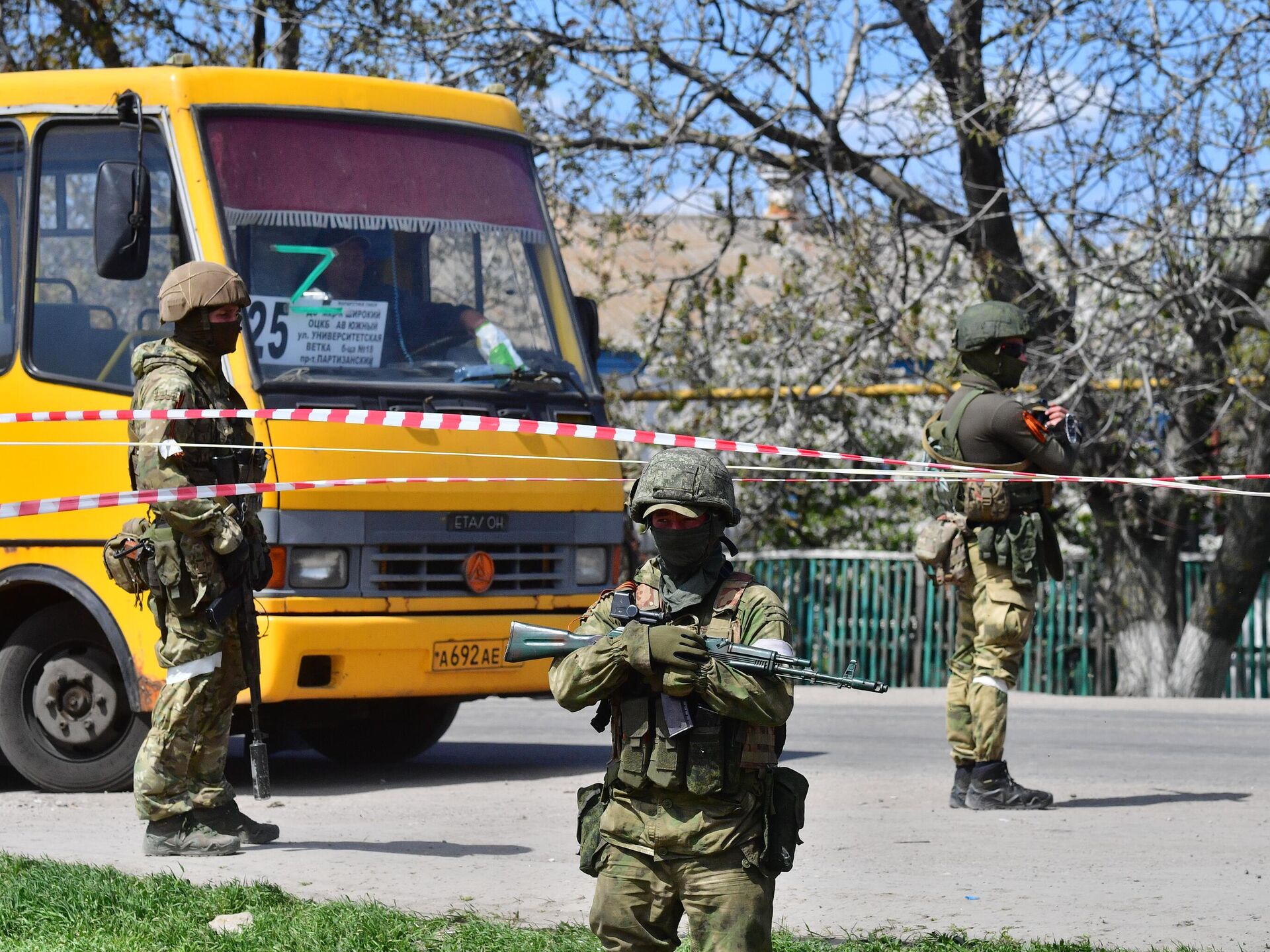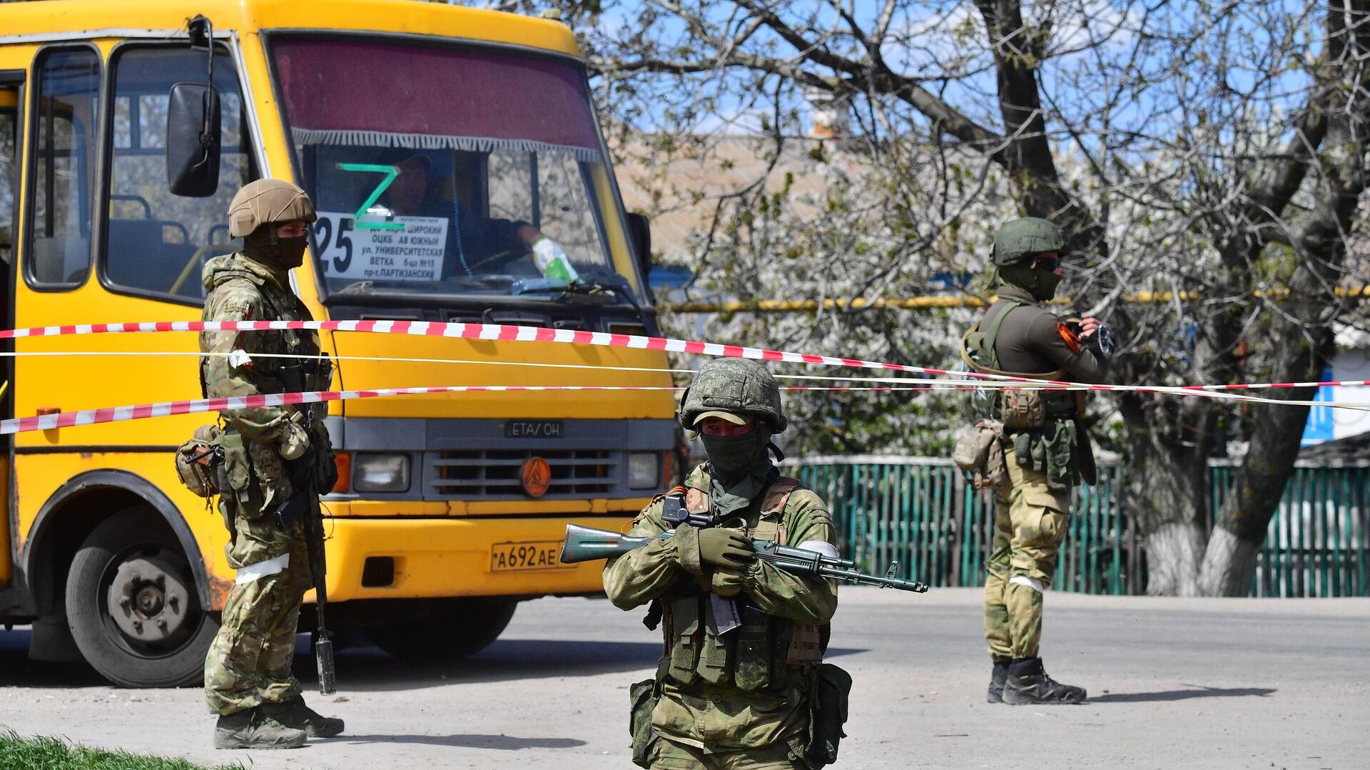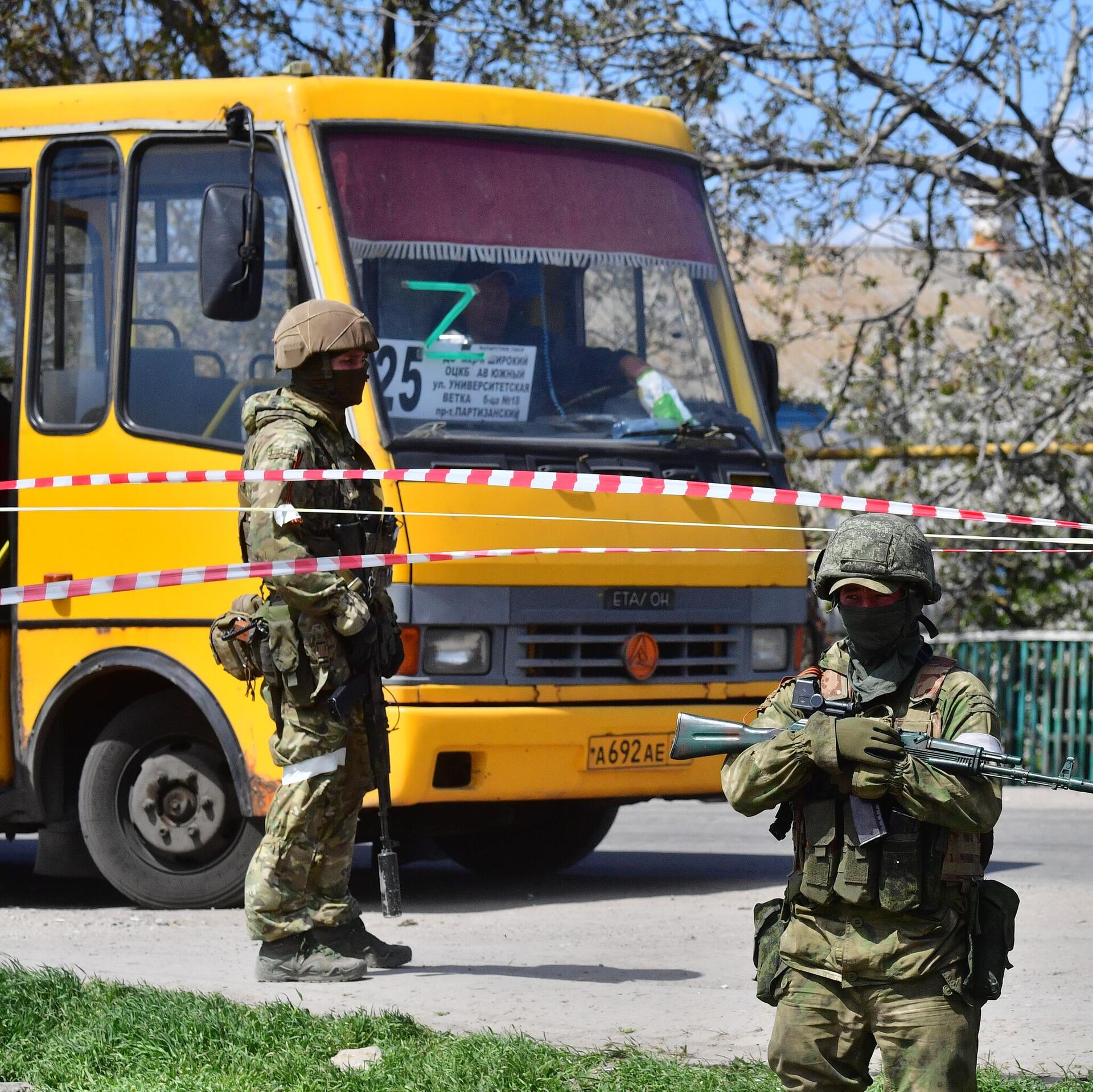 © РИА Новости / Алексей Куденко | Перейти в медиабанкВоеннослужащие возле автобуса с мирными жителями из района "Азовстали" в селе Безыменное