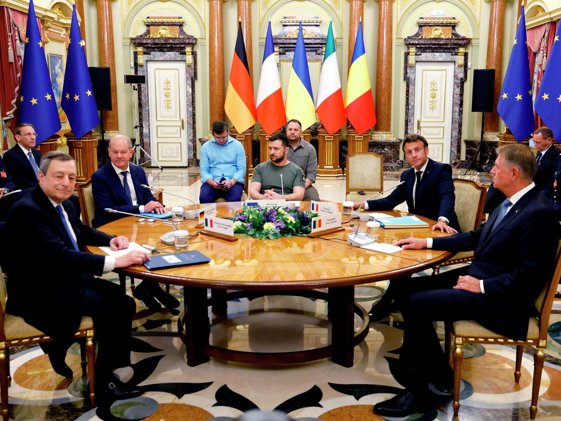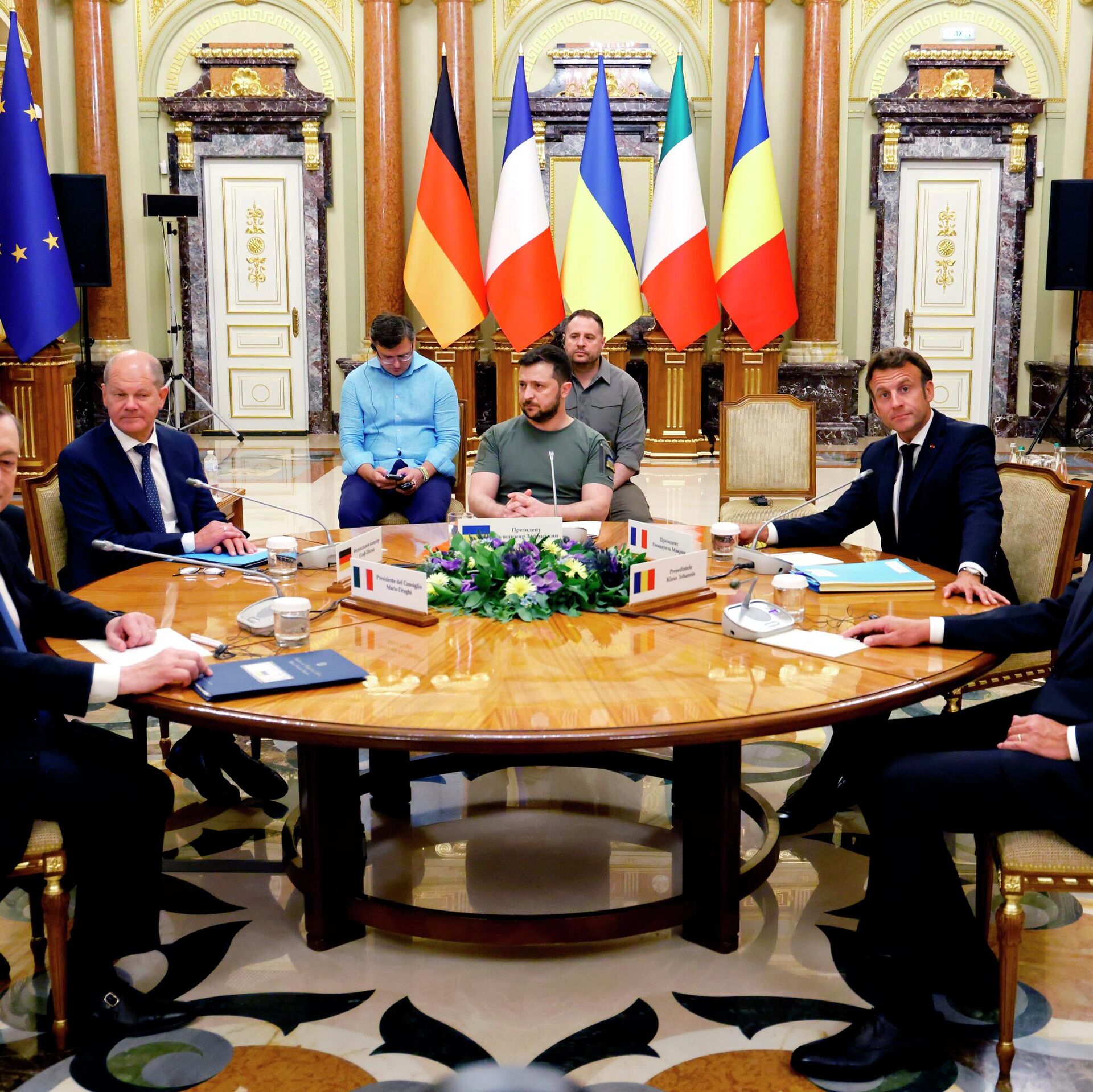 Президент Франции Эммануэль Макрон, канцлер ФРГ Олаф Шольц, премьер Италии Марио Драги и президент Румынии Клаус Йоханнис