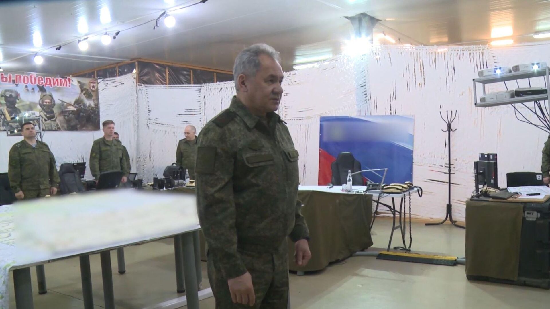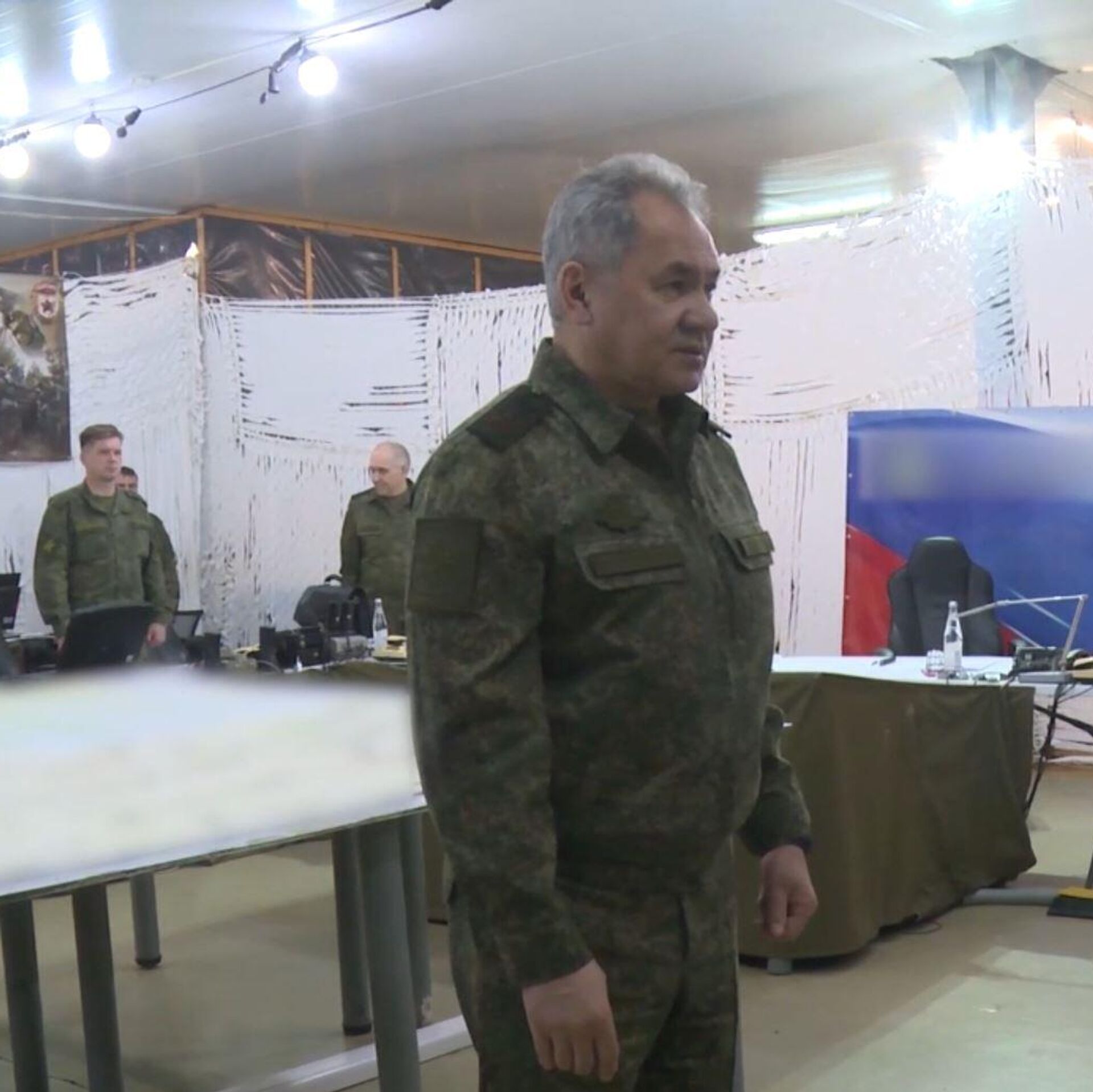 © Департамент информации и массовых коммуникаций Министерства обороны Российской ФедерацииМинистр обороны Российской Федерации генерал армии Сергей Шойгу во время инспекции российской группировки войск, задействованной в специальной военной операции на Украине. Кадр видео