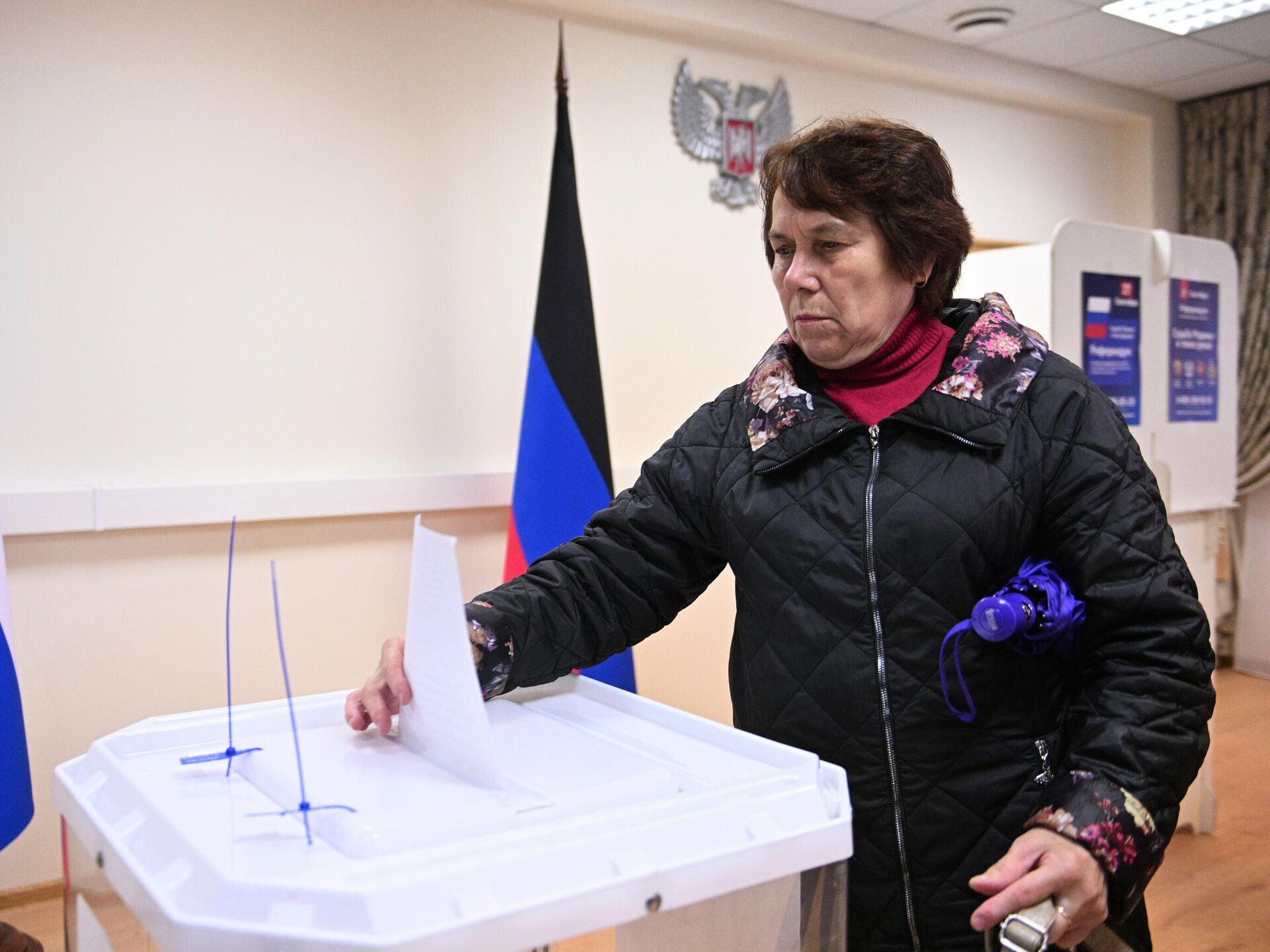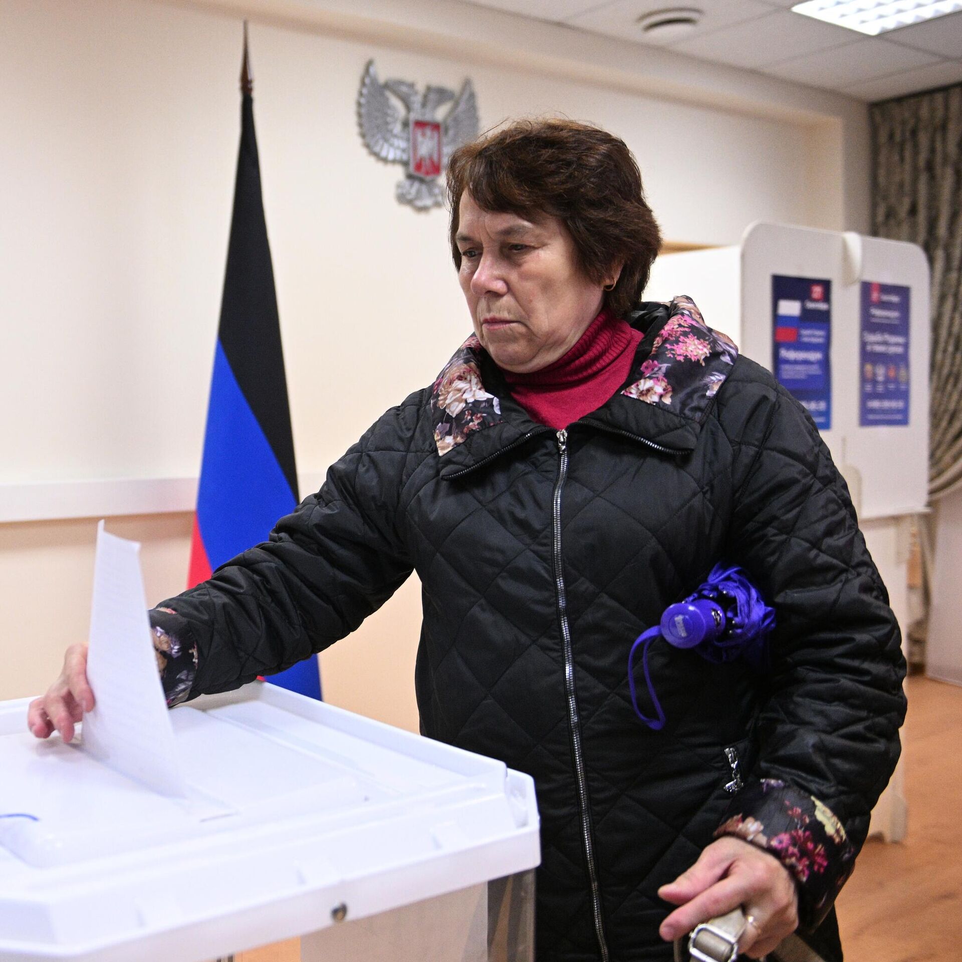 Женщина голосует на референдуме на избирательном участке в посольстве ДНР в Москве - РИА Новости, 1920, 24.09.2022
