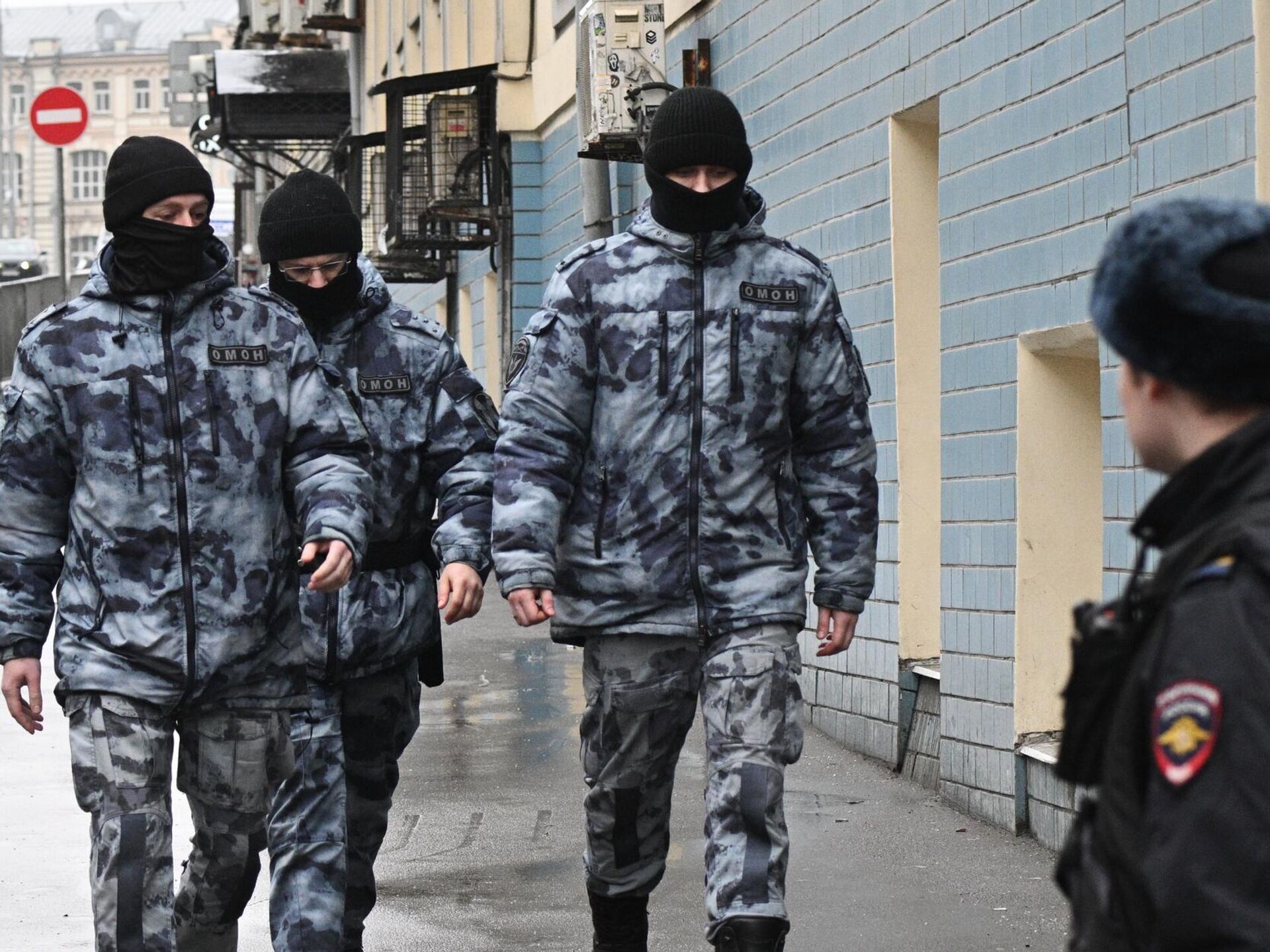 Сотрудники ОМОНа и полиции у Басманного суда Москвы, куда доставят подозреваемых в совершении теракта в подмосковном Крокус Сити Холле - РИА Новости, 1920, 29.03.2024