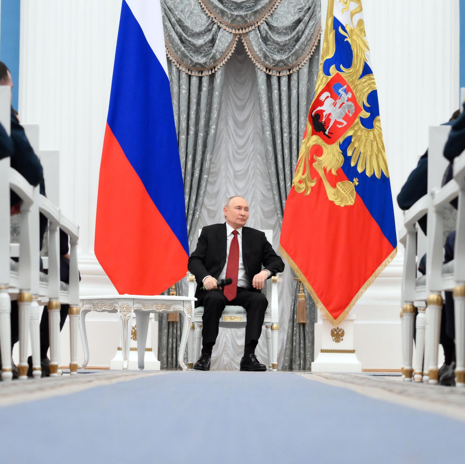 "Ваши товарищи по оружию, которые сейчас, вы знаете это лучше чем кто-либо другой, прямо в эти секунды исполняют свой долг перед Родиной на линии боевого соприкосновения, на фронте", — сказал Путин.