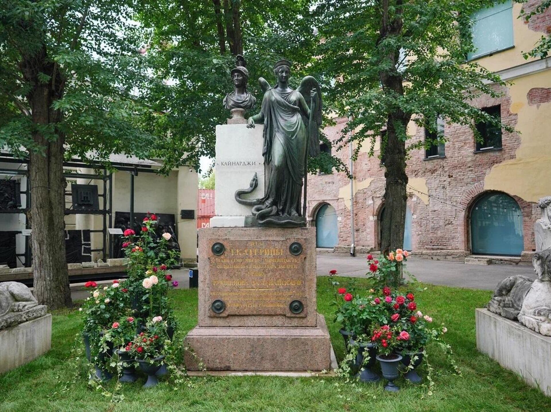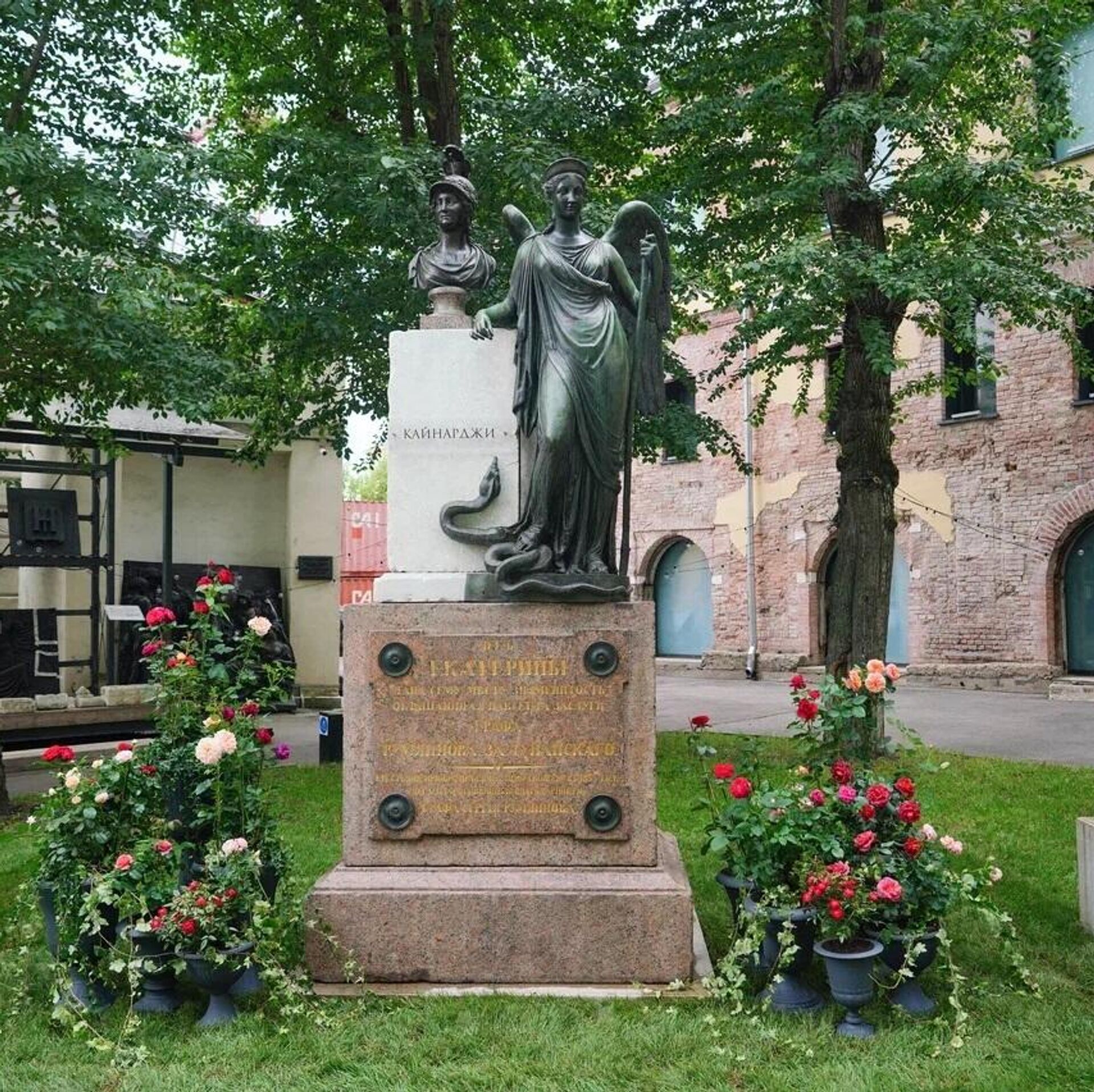 Василий Демут-Малиновский – крупнейший представитель русского классицизма – создал множество монументальных произведений, определивших облик Санкт-Петербурга. Он работал над оформлением Казанского собора, Михайловского дворца, Главного штаба. В 1830-е годы он получил заказ от графа Сергея Румянцева, сына сподвижника Екатерины II генерала Петра Румянцева-Задунайского, на изготовление монумента в память о победе в Русско-Турецкой войне. Им и стала композиция с бюстом Екатерины II.