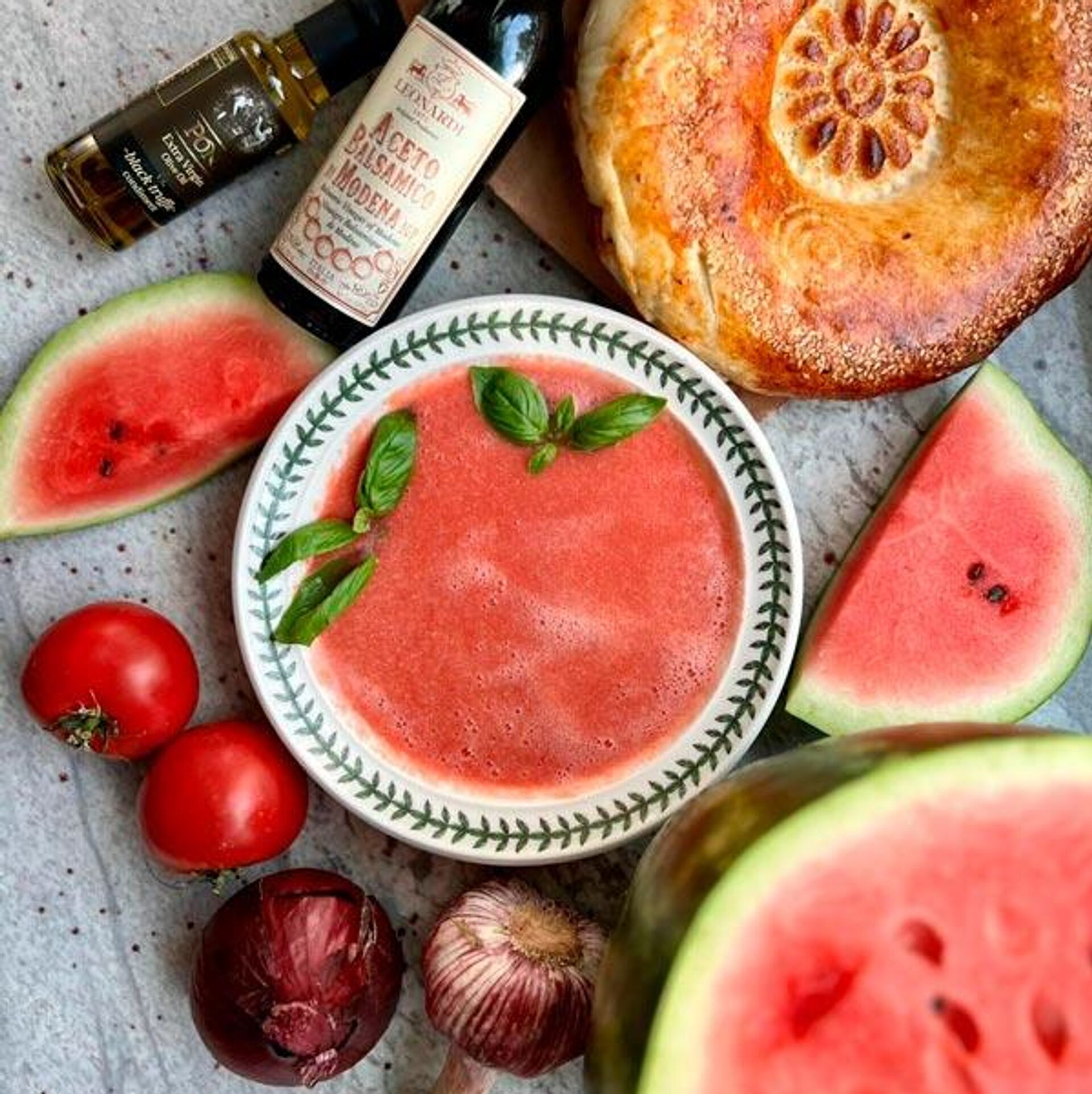 "Мой самый любимый летний суп — это гаспачо. Нам потребуется три больших спелых помидора, два больших огурца, пару красных болгарских перцев, небольшой кусочек красного сладкого лука, 1-2 зубчика чеснока, холодная вода, лед, оливковое масло, соль, перец и базилик. Можно добавить несколько капель лимона. Все это взбиваем в блендере и разливаем по тарелкам. При желании добавляйте замоченную чиабатту для насыщенности", — советует Лена Ландэ.