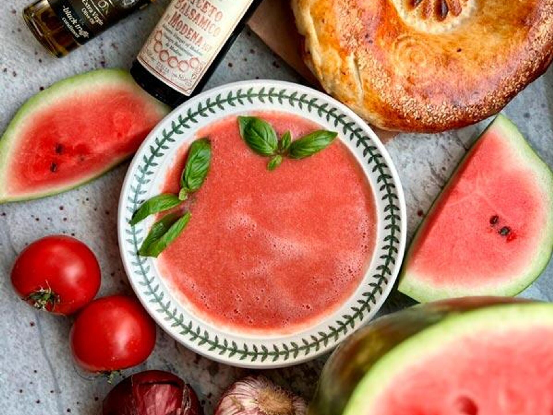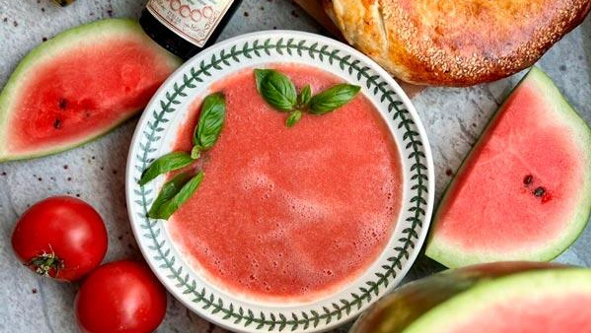 "Берем пол литра воды, растворяем ней 2-3 столовые ложки сахара, погружаем вместе с сиропом 400 г дыни в блендер, добавляем 50 мл белого сухого вина, лед, базилик тоже будет кстати. Все это перебиваем. Получается очень вкусно" — отметила бренд-шеф.