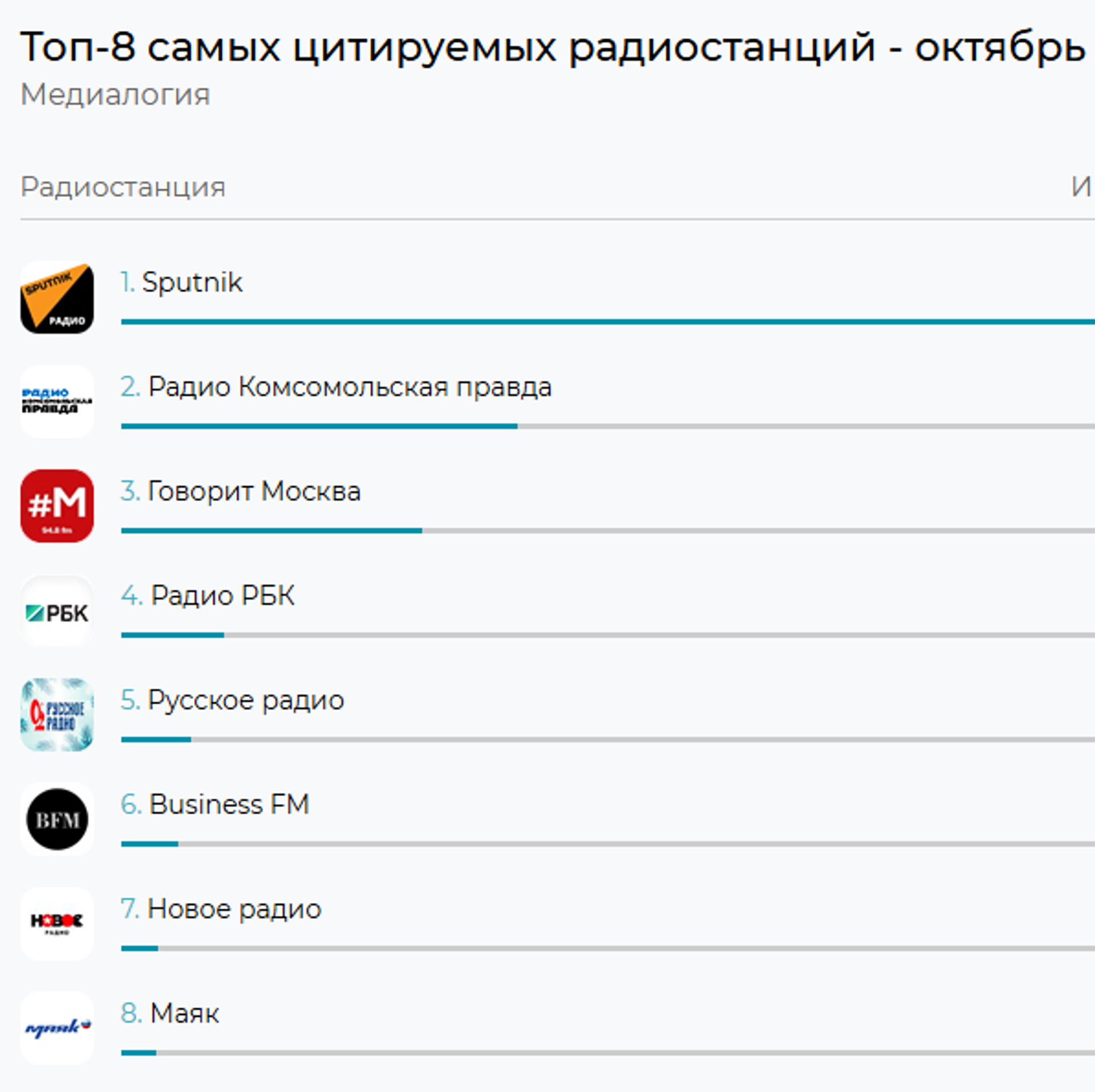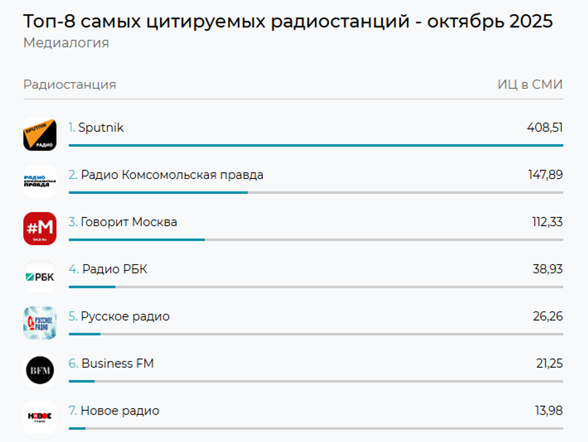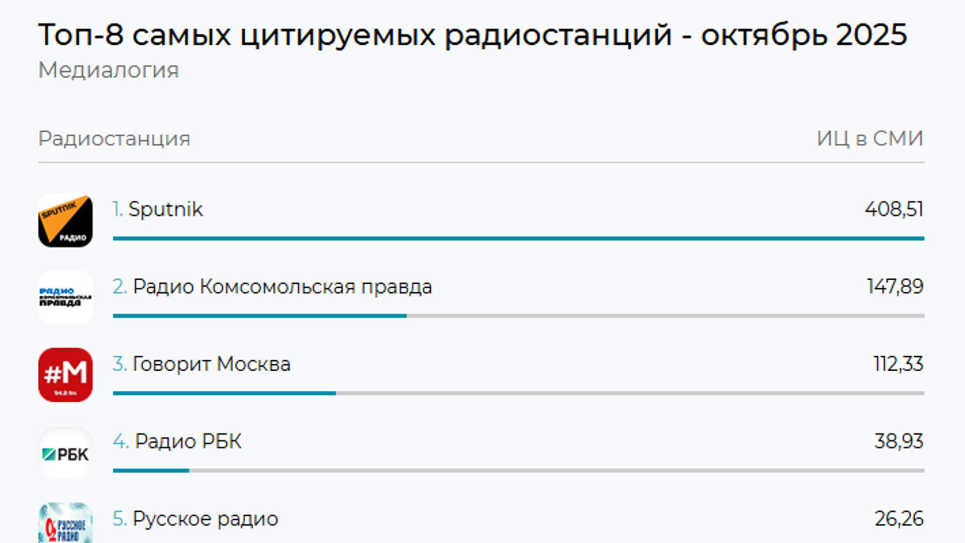 Индекс цитируемости радиостанции составил 408,51, что почти в три раза превышает показатель радио "Комсомольская правда", расположившегося на втором месте с индексом цитируемости 147,89.