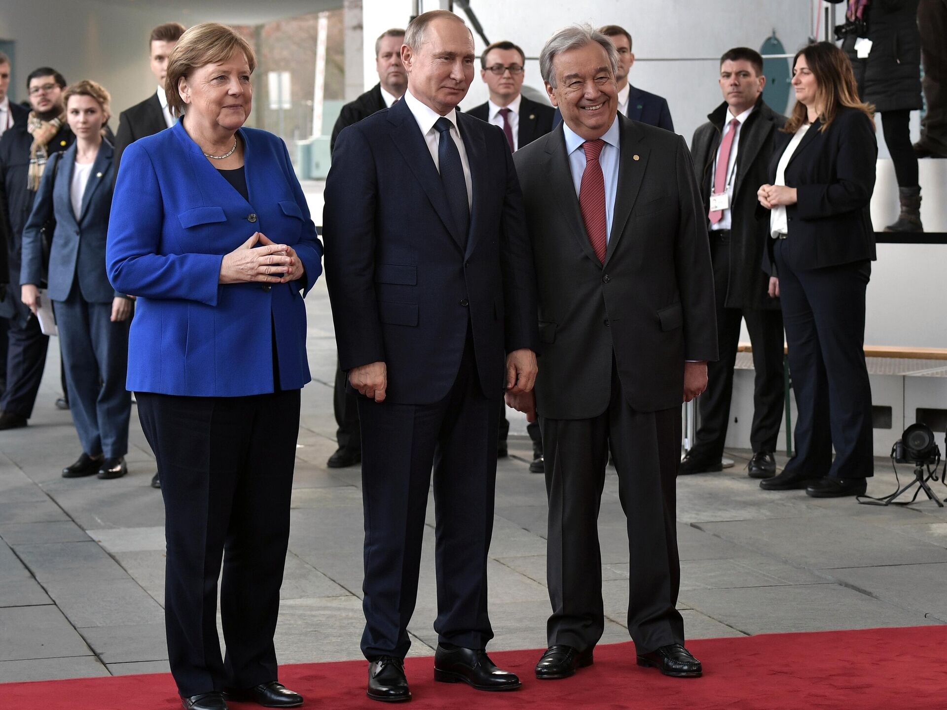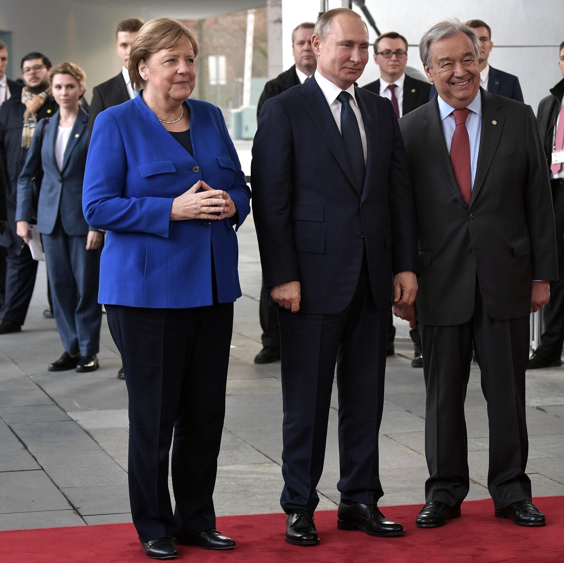 Президент РФ Владимир Путин, федеральный канцлер ФРГ Ангела Меркель и генеральный секретарь ООН Антониу Гутерреш на Международной конференции по Ливии - РИА Новости, 1920, 12.12.2025