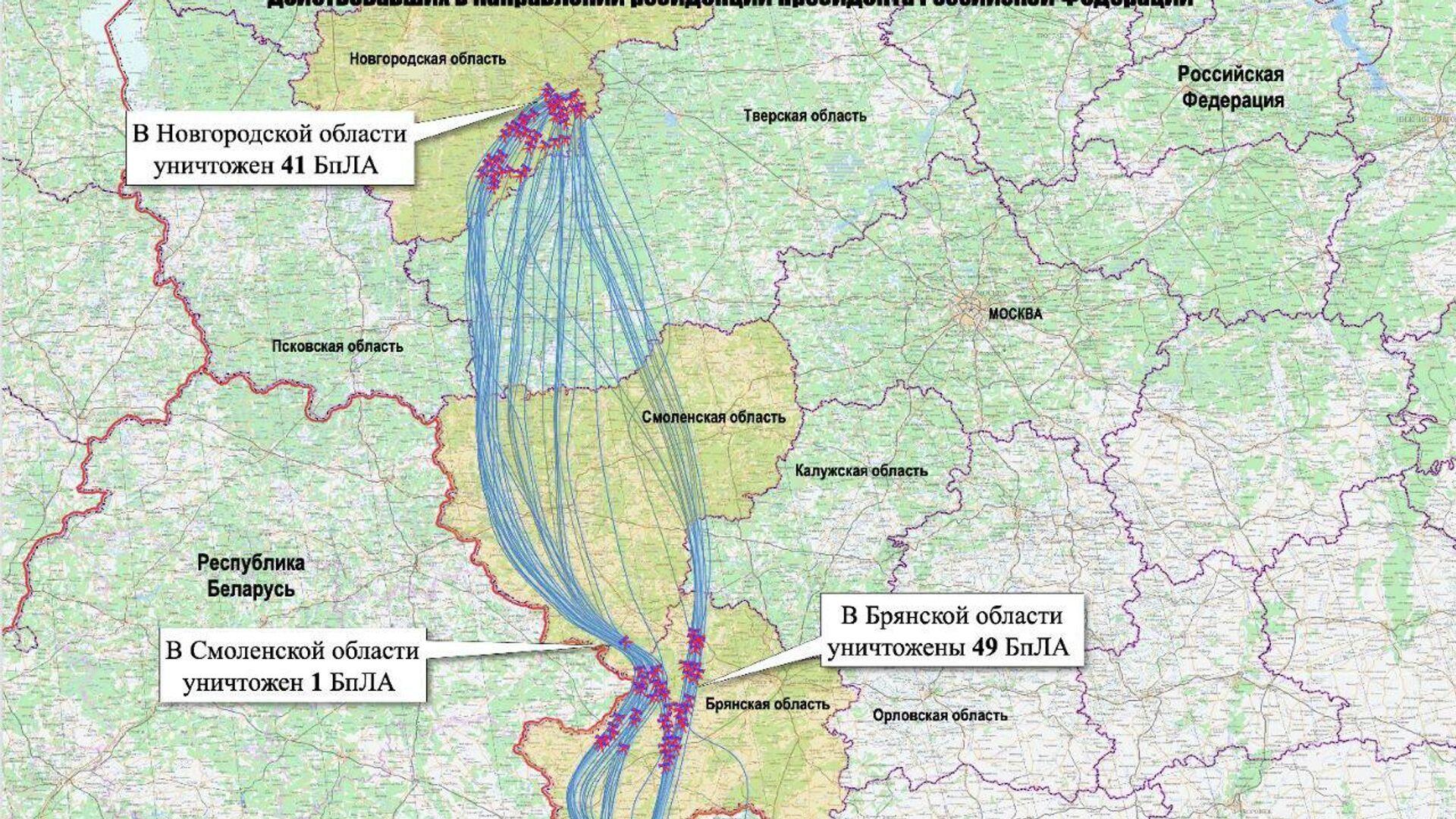 МО показало карту полета украинских БПЛА, пытавшихся атаковать резиденцию Путина - Радио Sputnik, 31.12.2025