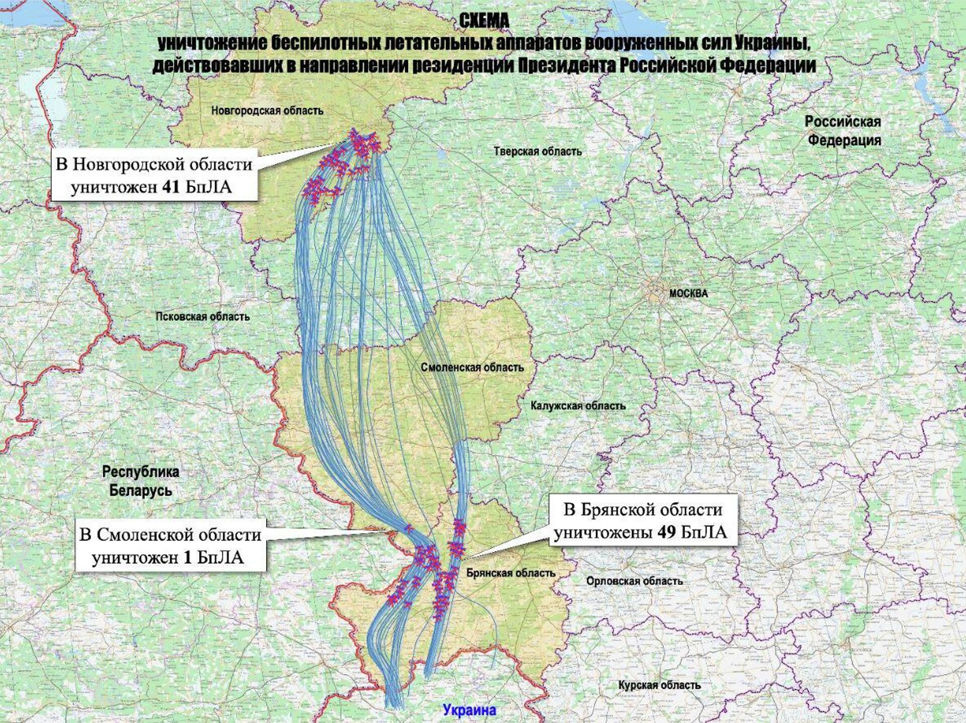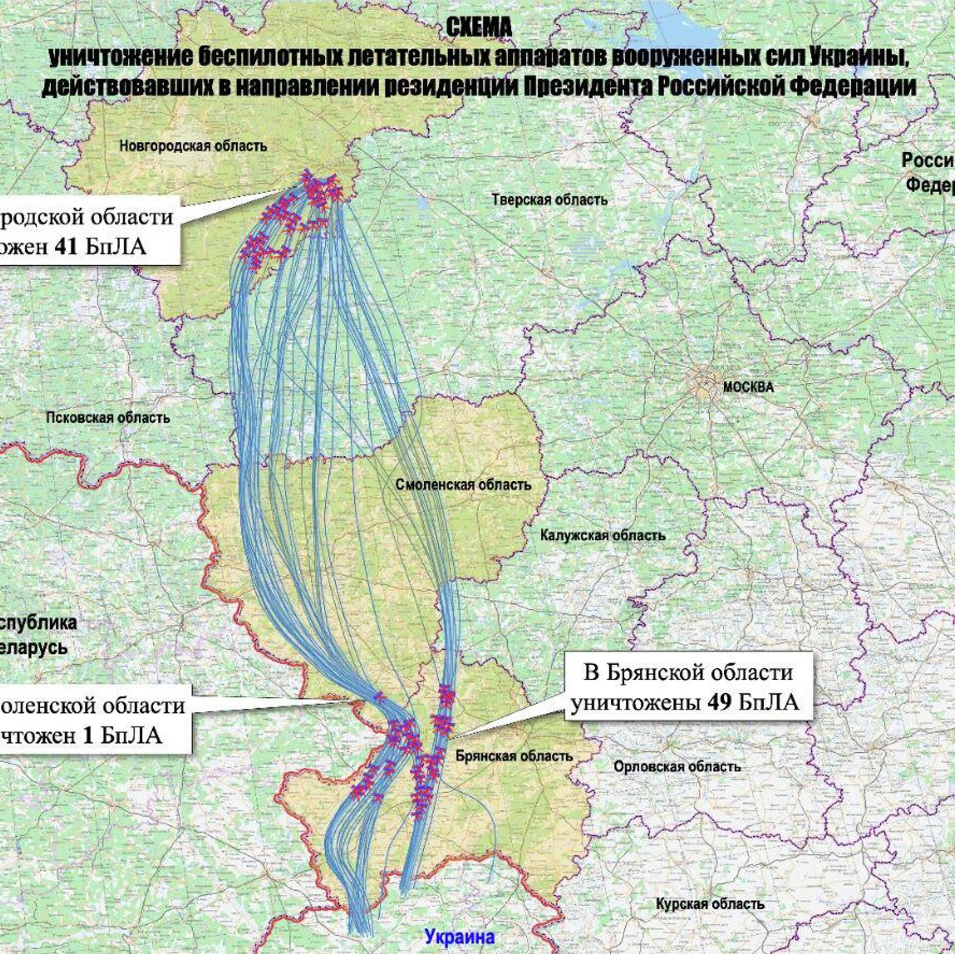 МО показало карту полета украинских БПЛА, пытавшихся атаковать резиденцию Путина