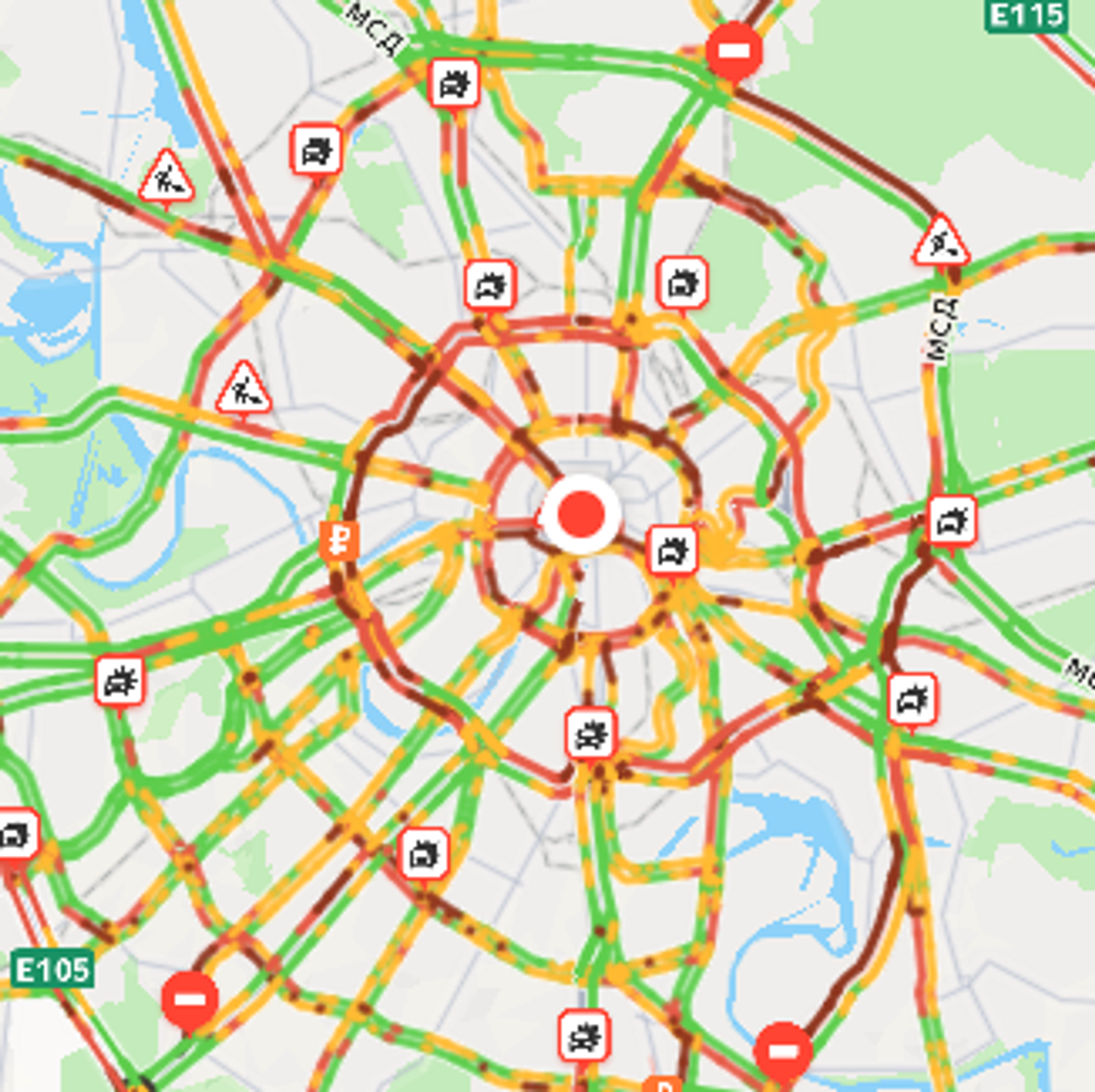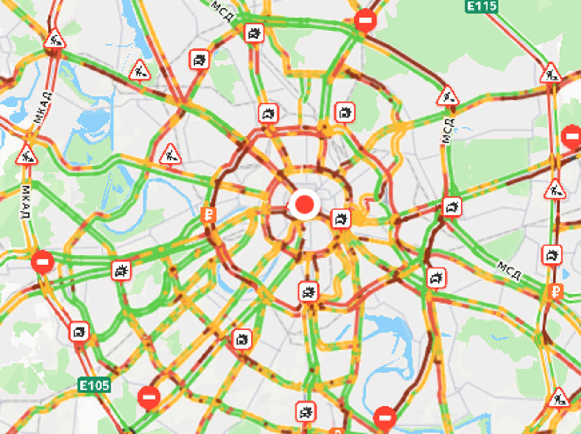 Сильные заторы наблюдаются на большей части МКАД, МСД в районе Курьянова, на СВХ в районе Лосиного острова, Смоленской и Ростовской набережных, Большом Каменном мосту, Пятницкой улице и других.