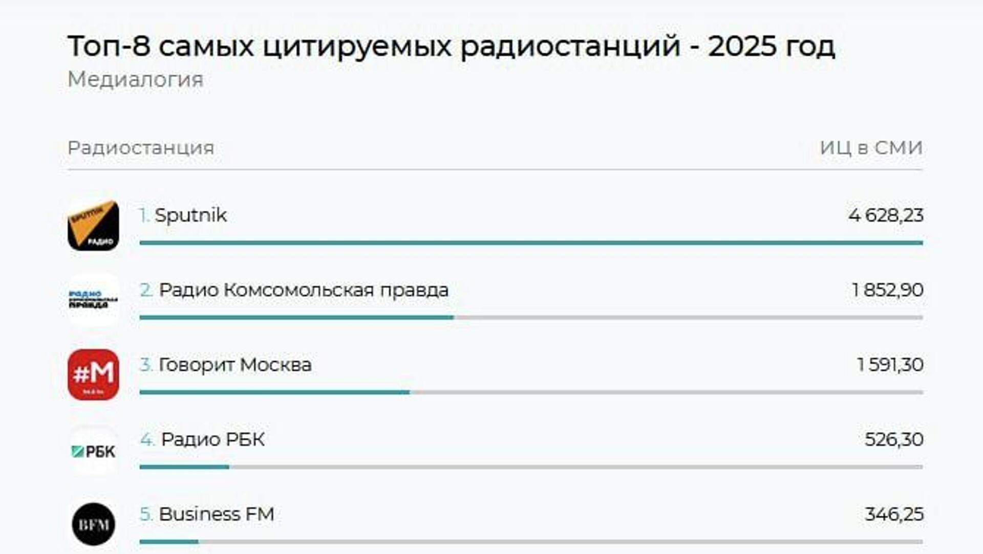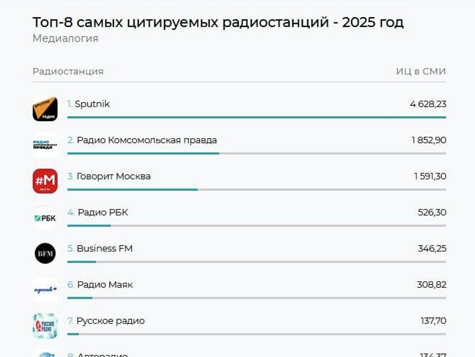 Индекс цитируемости радио Sputnik за год составил 4 628,23 балла. На втором месте – радио "Комсомольская правда" с результатом 1 852,90. Замыкает тройку лидеров радио "Говорит Москва" с индексом 1 591,30.
