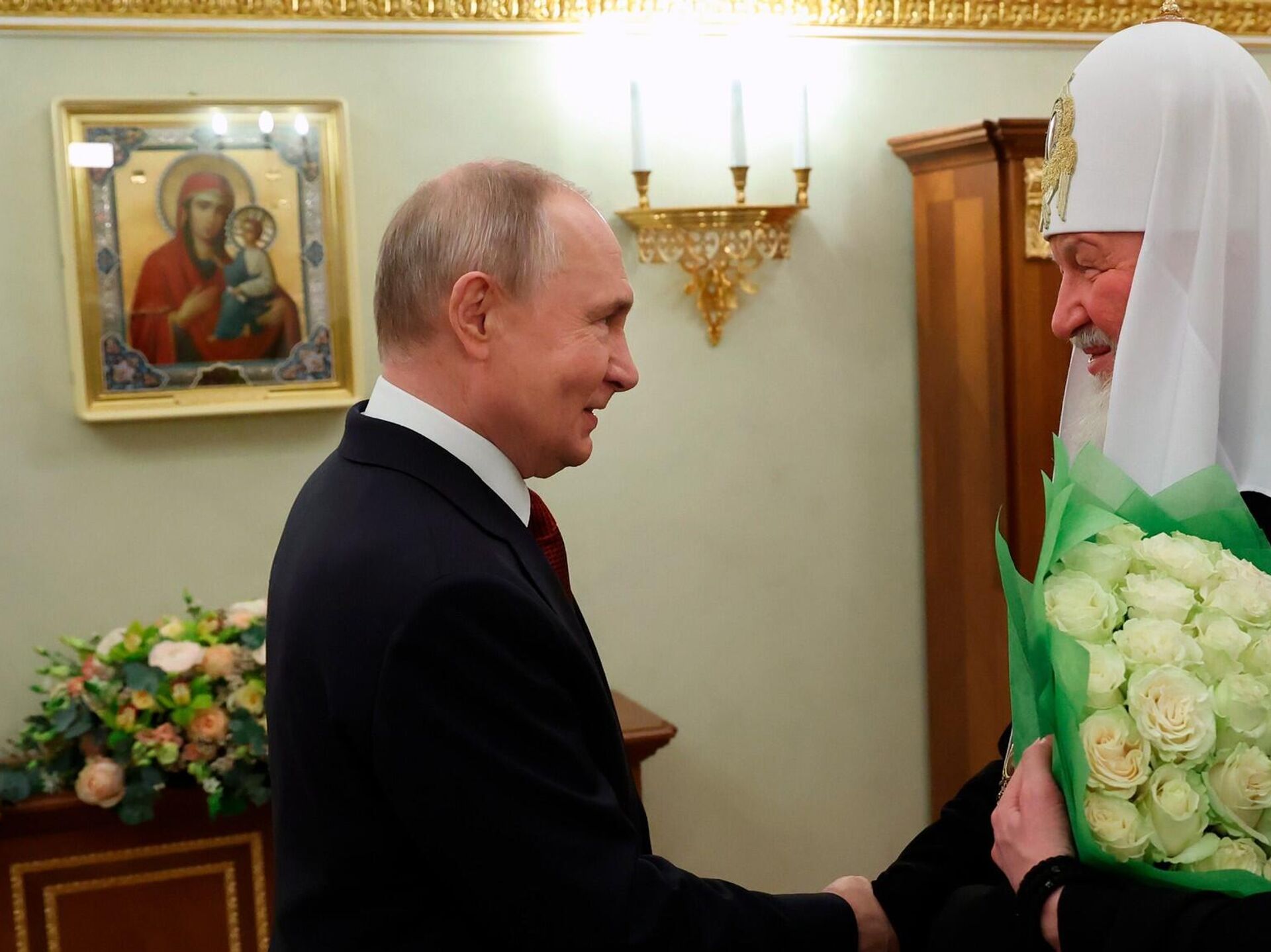 Патриарх Кирилл, в свою очередь, выразил благодарность президенту за уникальный характер взаимоотношений между Церковью и государством. Он охарактеризовал уровень этого взаимодействия как убедительное свидетельство верного курса государственной политики в отношении Церкви, ее достойного положения в обществе и возможности оказывать духовную поддержку народу, подчеркнув личную роль в этом президента.