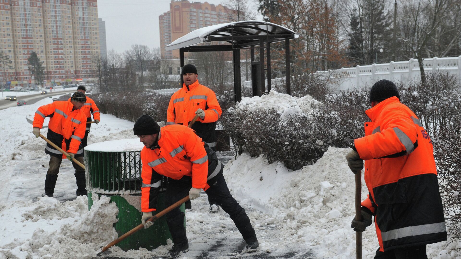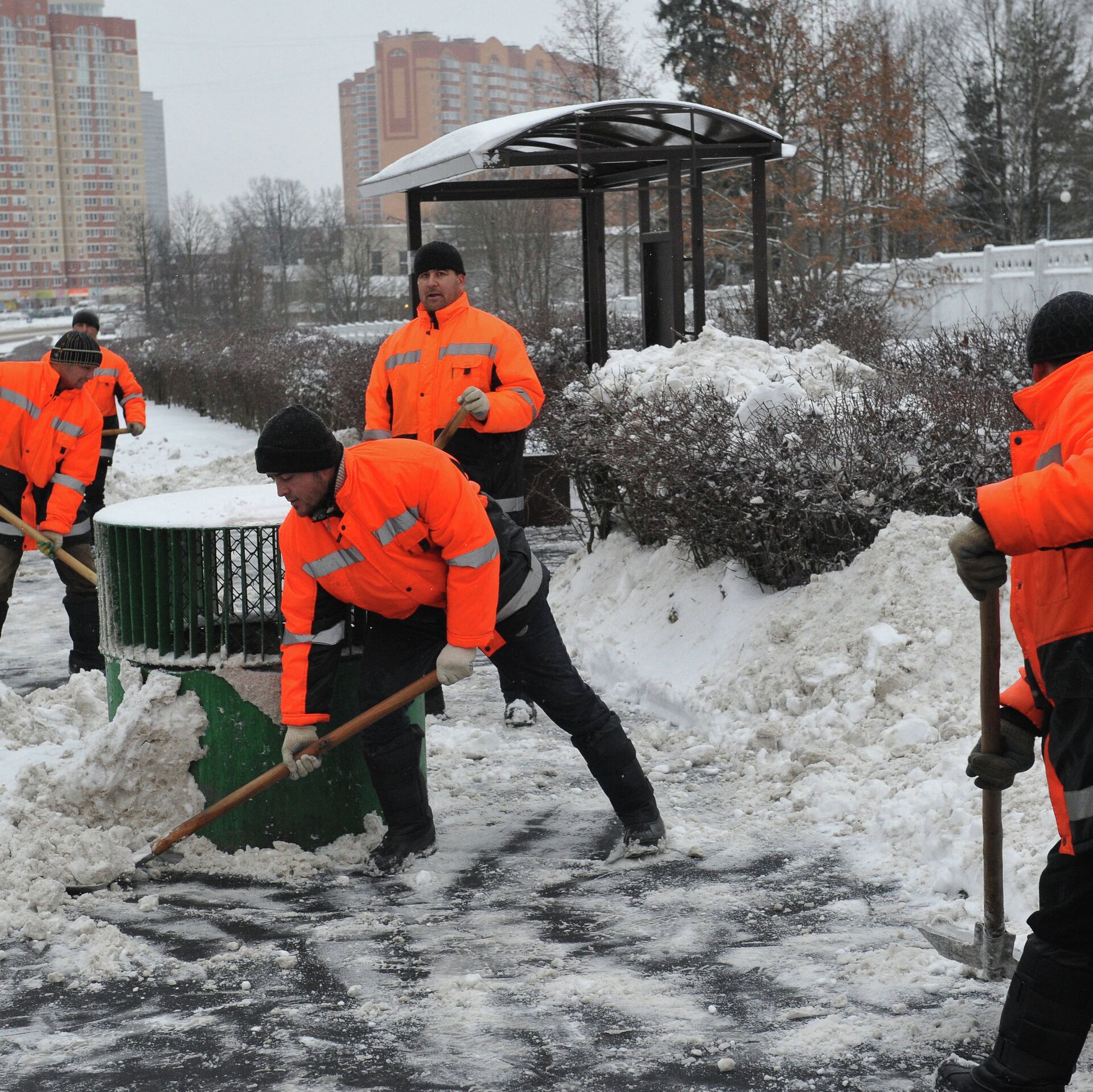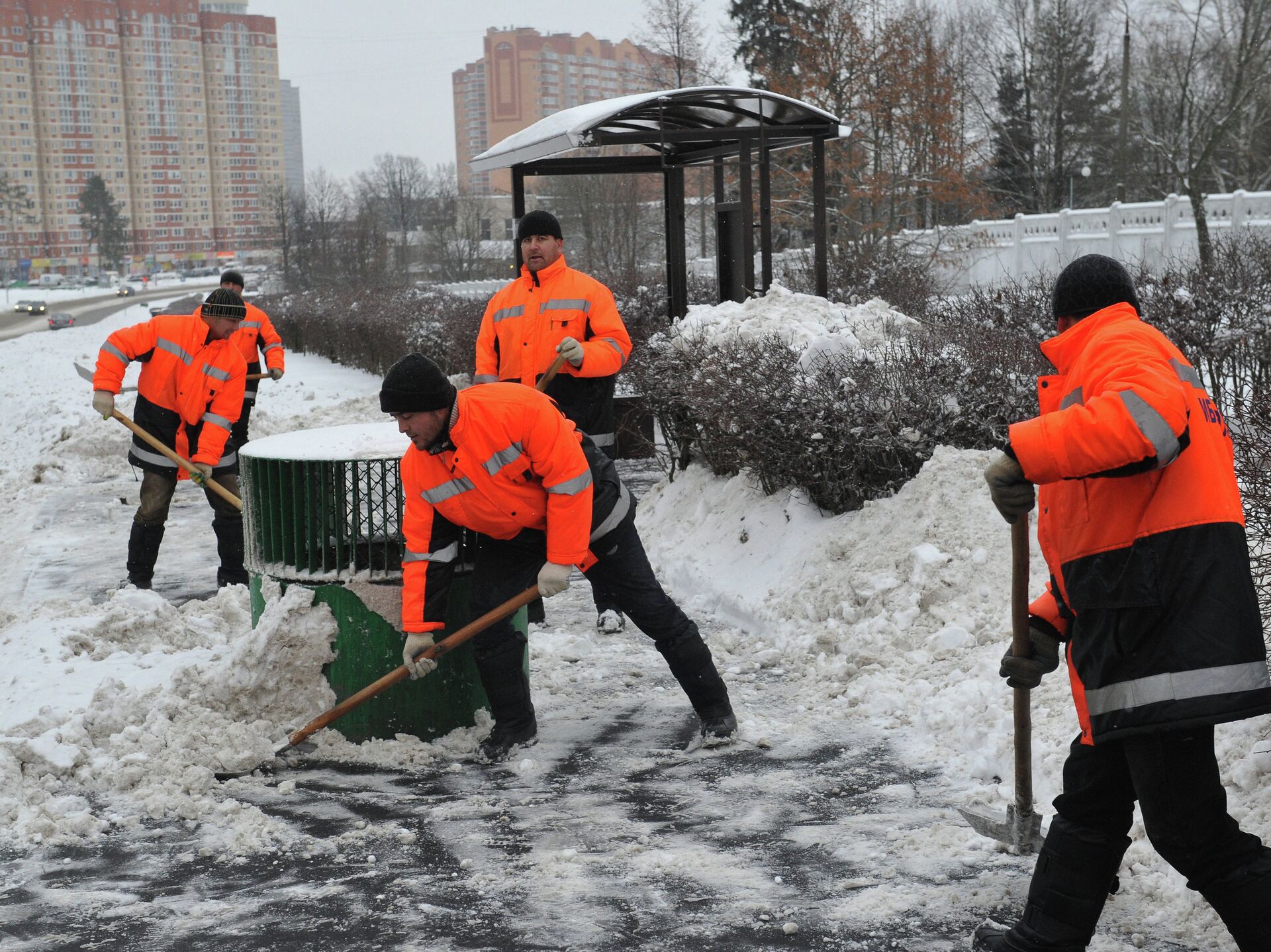 © РИА Новости / Алексей Куденко | Перейти в медиабанкСотрудники коммунальных служб убирают снег с территории автобусной остановки